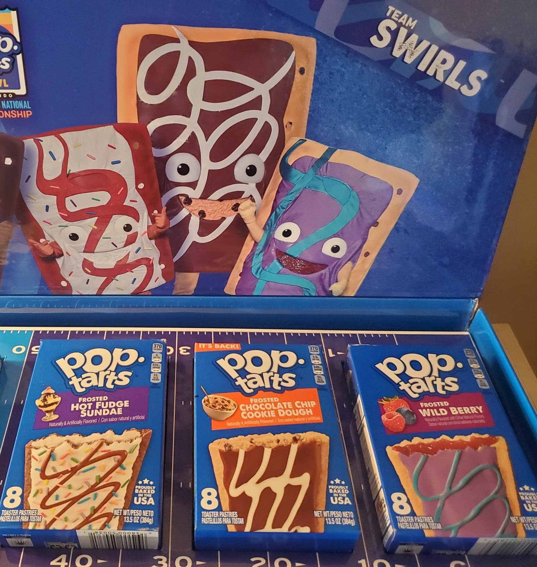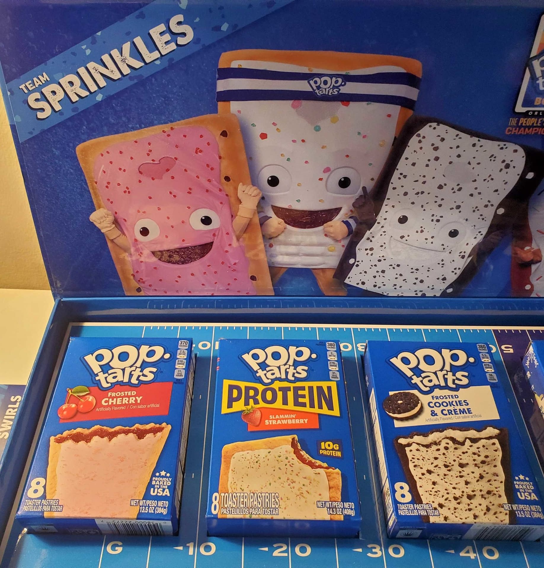 The team that came up with the idea definitely deserves its flowers, as the look and design are top-notch. Plus, how can you go wrong with a box of Pop-Tarts for each of the Edible Mascots in play for Team Sprinkles or Team Swirls? That means we have Protein Slammin' Strawberry, Frosted Cherry, Frosted Cookies & Crème, Frosted Chocolate Chip Cookie Dough, Frosted Wild Berry, and Frosted Hot Fudge Sundae – a very fine selection (and also the largest amount of Pop-Tarts I've ever owned at any one time in my life).