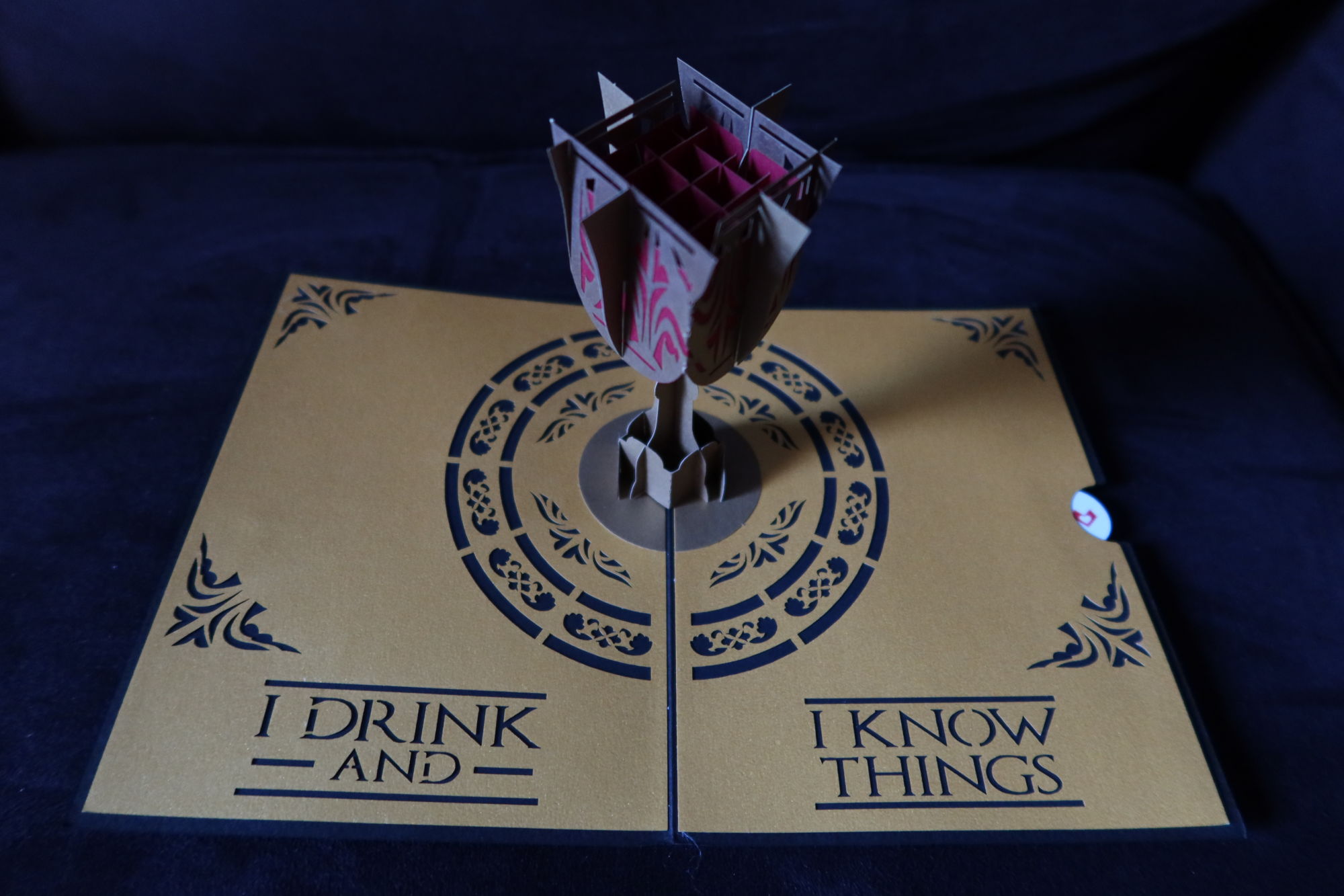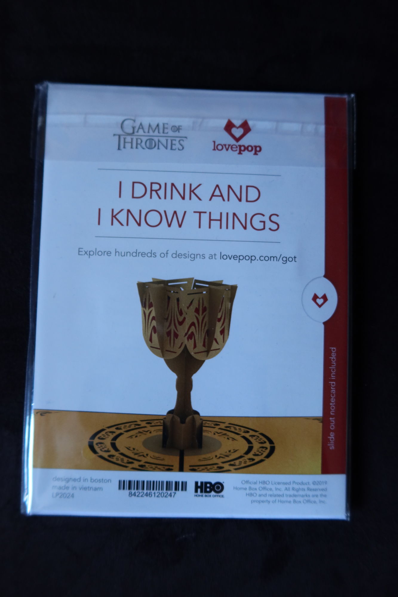 First off, we have a special Lovepop Card designed with the show in mind. It is a goblet filled with wine, and as the card opens up, it turns into a 3D paper cutout of the object. Taking one of the greatest lines from the series, spoken by Peter Dinklage as Tyrion Lannister, "I drink, and I know things." Inside the sleeve is a separate piece of paper to which you can write a personal message. I love these cards as they are above and beyond a joyful piece of sentimental expression. I mean, if you're going to get this kind of card above something from Hallmark, you know they care.