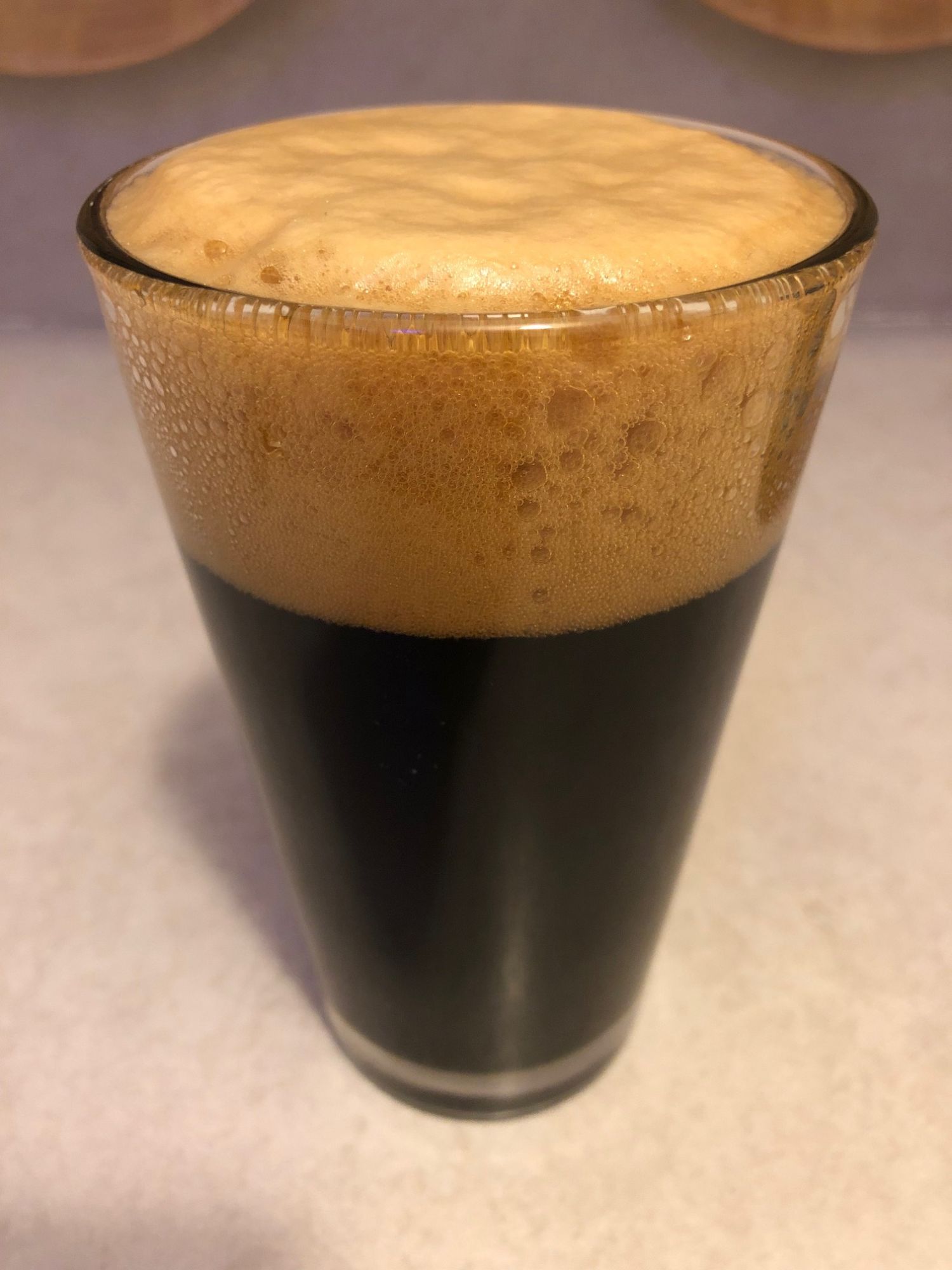 First off, the look of this is about as dark a brown as you'll find on a stout. It is rich, to the point of nearly being a thick brew, and looks almost black when sitting in the pint glass. Even on a slow and measured pour, the head grows off of this like snow on a winter's hill. The shot you see below was about as careful of a pour as I could make with nearly a third of it being the head, which leaves behind lovely lace lines once they die down. On just a pure sip of this without any food, it comes off smokey at first, followed by a heavy bourbon and vanilla taste. This is one of those beers that, as you drink it, you know exactly where your throat is all the way down to the kidneys. It's not a heavy drink, but the bittersweet taste and the mixture of components will go through you and find a warm spot to cuddle up in.