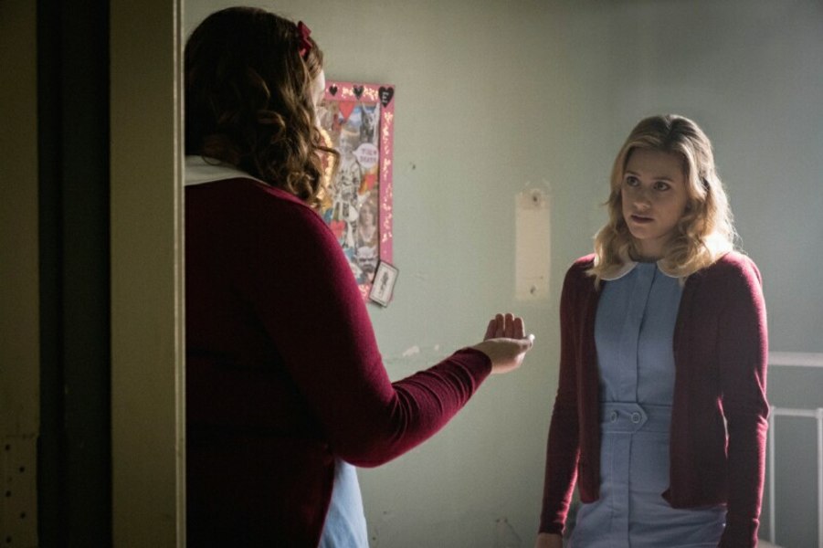 After seeing the GK's chamber, Betty decides she needs to get in the infirmary to check medical records for why they are giving hard drugs to kids. This is also after seeing Claudius Blossom and Hiram Lodge meeting with the nuns, and Hiram is again referred to as the Man in Black. Really its a charcoal coat, but semantics. She starts a fight with Ethel over her kiss with Jughead and fakes a seizure to get into the infirmary (why did she have to fight with Ethel…), and discovers in her own file that her morning doses of drugs have been increased by one "HL". Seeing enough, she tries to flee using the tunnel escape that Veronica used to help Cheryl escape last season. Problem though: it has been bricked off. New Riverdale badass Ethel and the rest of the Sisters arrive and force Betty to take her Fizzle Rocks. They throw her into GK's chamber, and before you know it, Betty is drugged and back to the inkblot test. this time, without hesitation, her answers come swiftly: dead body, Black Hood, Gargoyle King, who is now standing menacingly behind Sister Woodhouse.