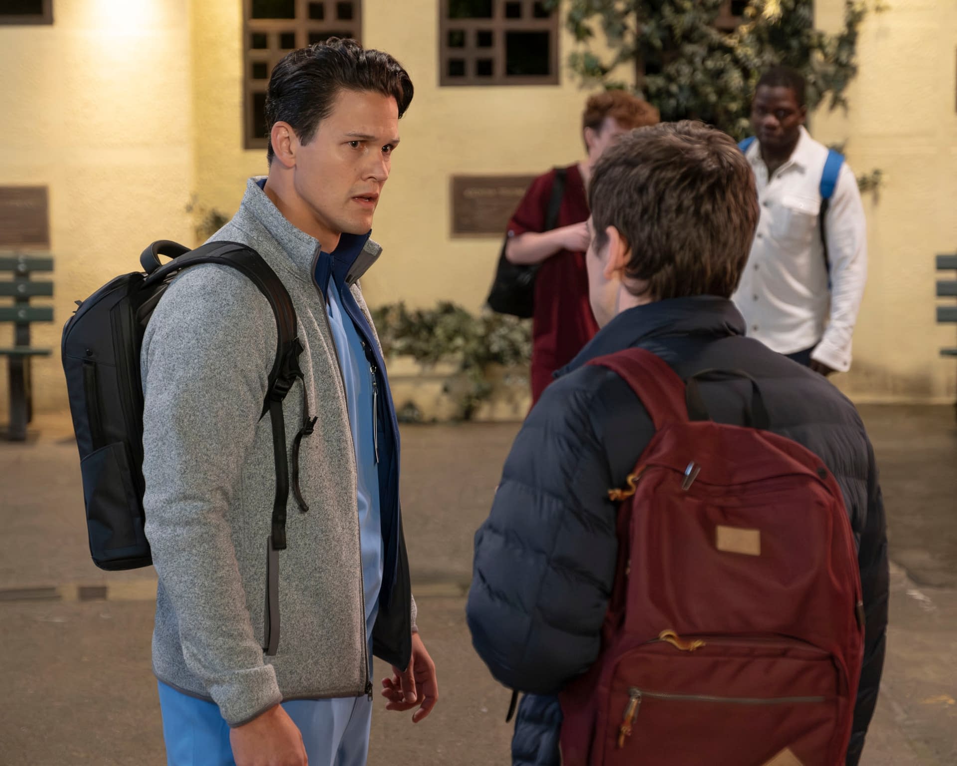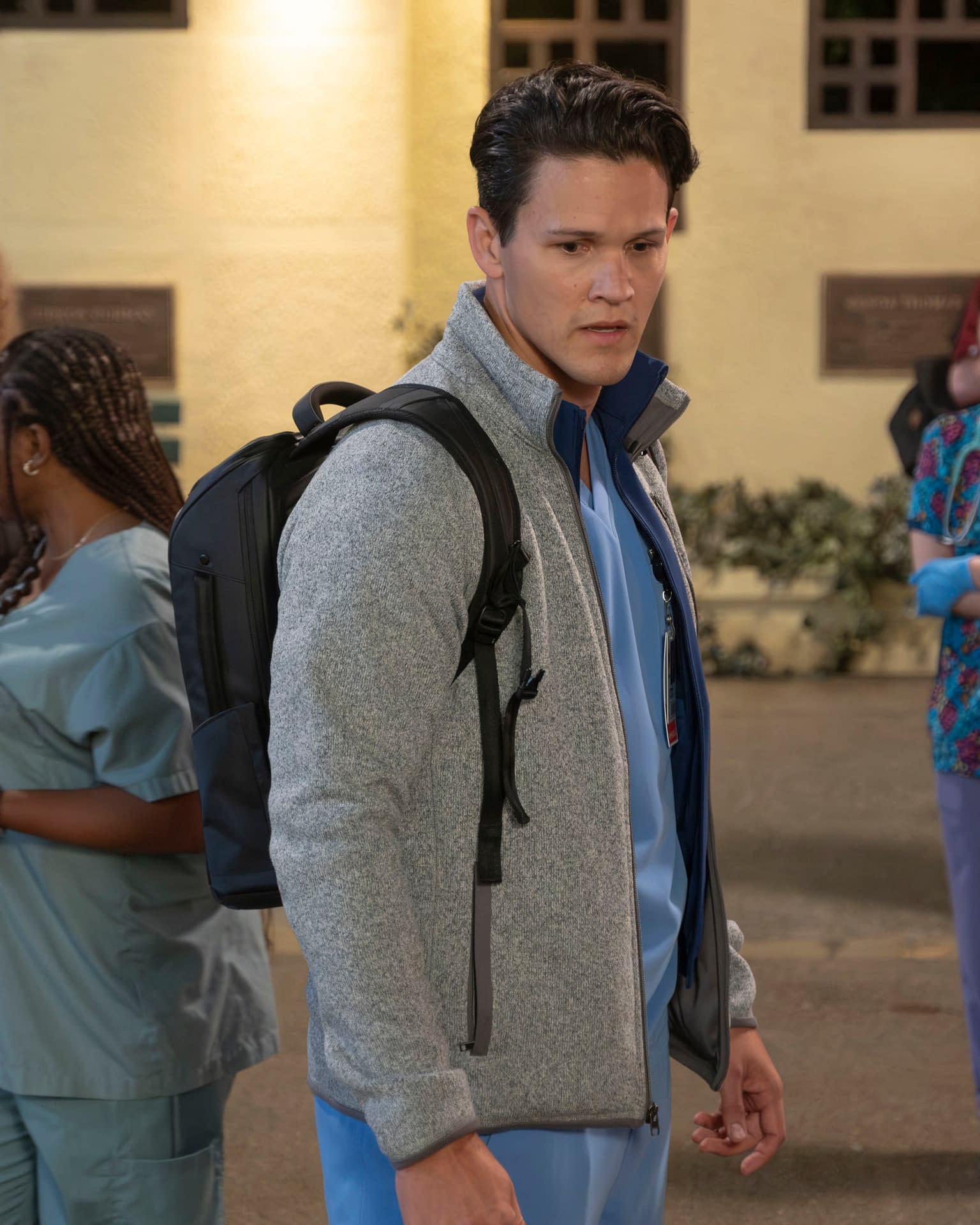 David Gridley's Blake, Jacob Dudman's Asher & Ava Bunn's Sam "Tosh": "The medical interns are Blake, Asher, and Tosh. Blake [David Gridley] is 35, and one of the things we wanted to focus on is that some people get around to being interns later in life. We're going to be telling a story about him that's slowly being revealed throughout the course of the season. He has a chip on his shoulder and doesn't like being treated like a kid," Braff shared. "Asher [Jacob Dudman], in the middle, is an English guy, so that gave us an interesting way to have some commentary on him digesting the American health-care system. Why an English kid ended up working in an American hospital is revealed throughout the course of the season. He's a bit nervous and behind the rest in terms of his confidence and his ability."