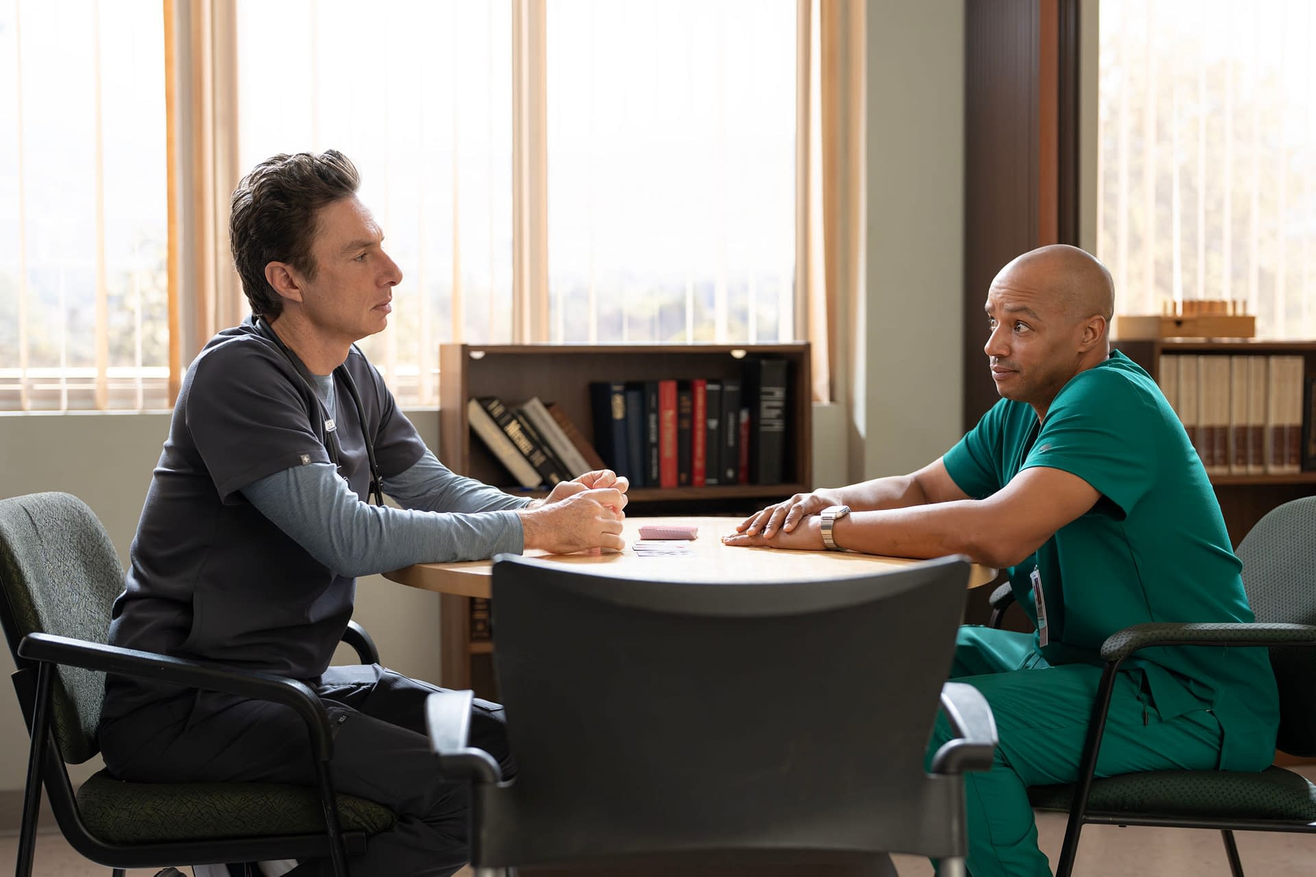 Welcome back to our weekly pregame preview for ABC and original series creator Bill Lawrence's Zach Braff, Donald Faison, Sarah Chalke, Judy Reyes, and John C. McGinley-starring Scrubs. In S01E04: "My Poker Face," JD (Braff) looks to bring back poker night, Elliot (Chalke) deals with a patient who's all about social media, and the interns start getting more than a bit competitive. After checking out the official overview, image gallery, and more, stick around for the official overview for S01E05: "My Angel," in which Turk (Faison) looks to help JD get back into the dating game; and S01E06: "My V.I.P.," in which JD and Dr. Park (Joel Kim Booster) reluctantly team up to help a hospital board member with a health crisis. In addition, we've included what Braff and Faison shared with ABC News about the revival series and how real-world headlines affect it.