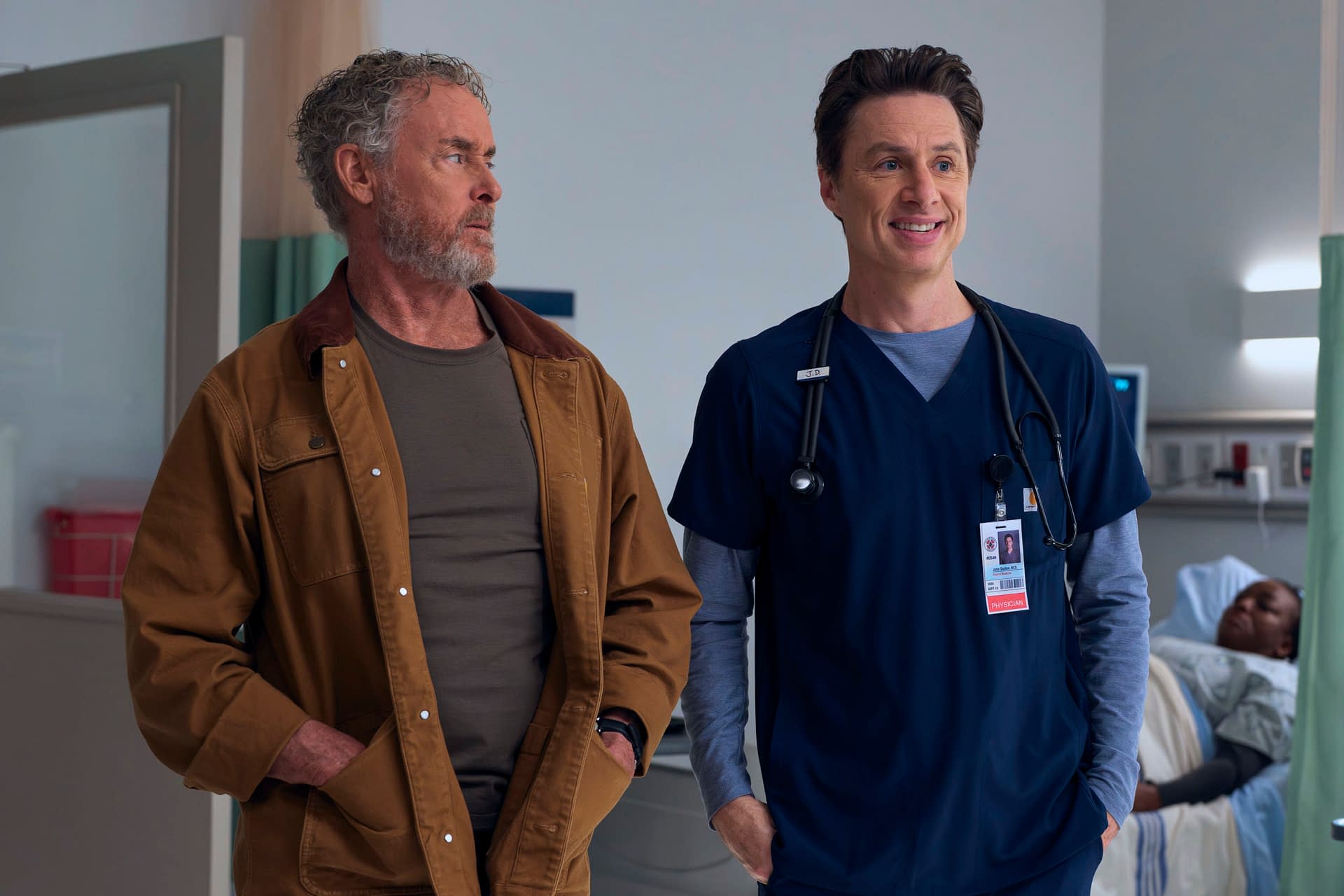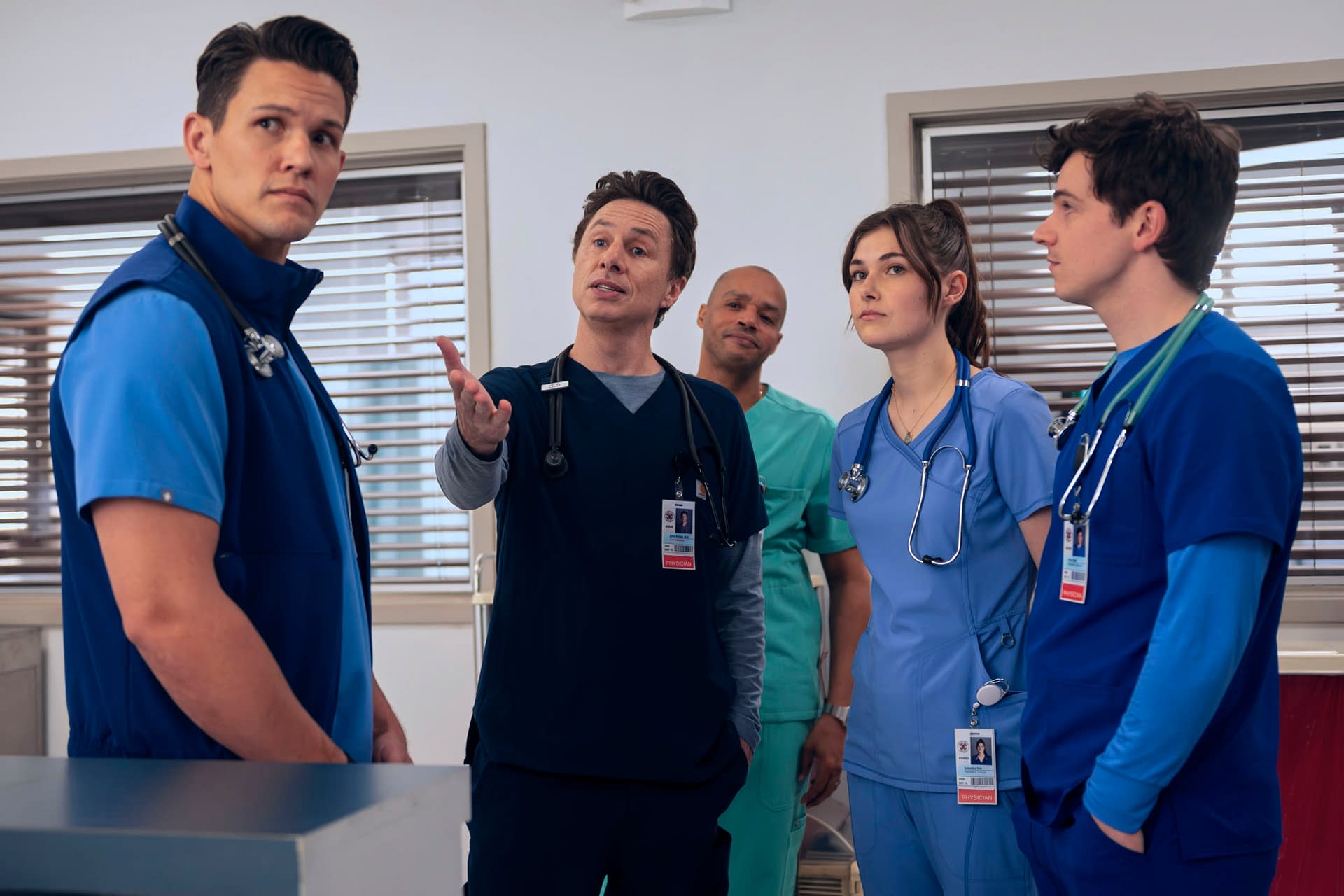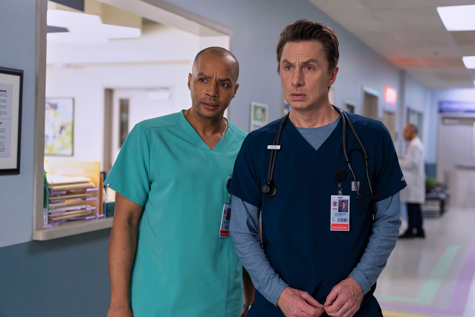 JD and Turk scrub in together for the first time in a long time: Medicine has changed; interns have changed; but their bromance has stood the test of time. Characters new and old navigate the waters of Sacred Heart with laughter, heart, and some surprises along the way. The 30-minute revival comedy series stars Zach Braff as John "J.D." Dorian, Donald Faison as Christopher Turk, and Sarah Chalke as Elliot Reid. Original cast Judy Reyes and John C. McGinley will guest-star as Carla and Dr. Perry Cox, respectively.