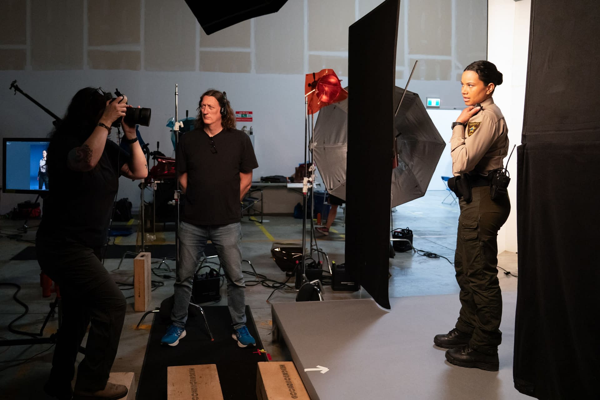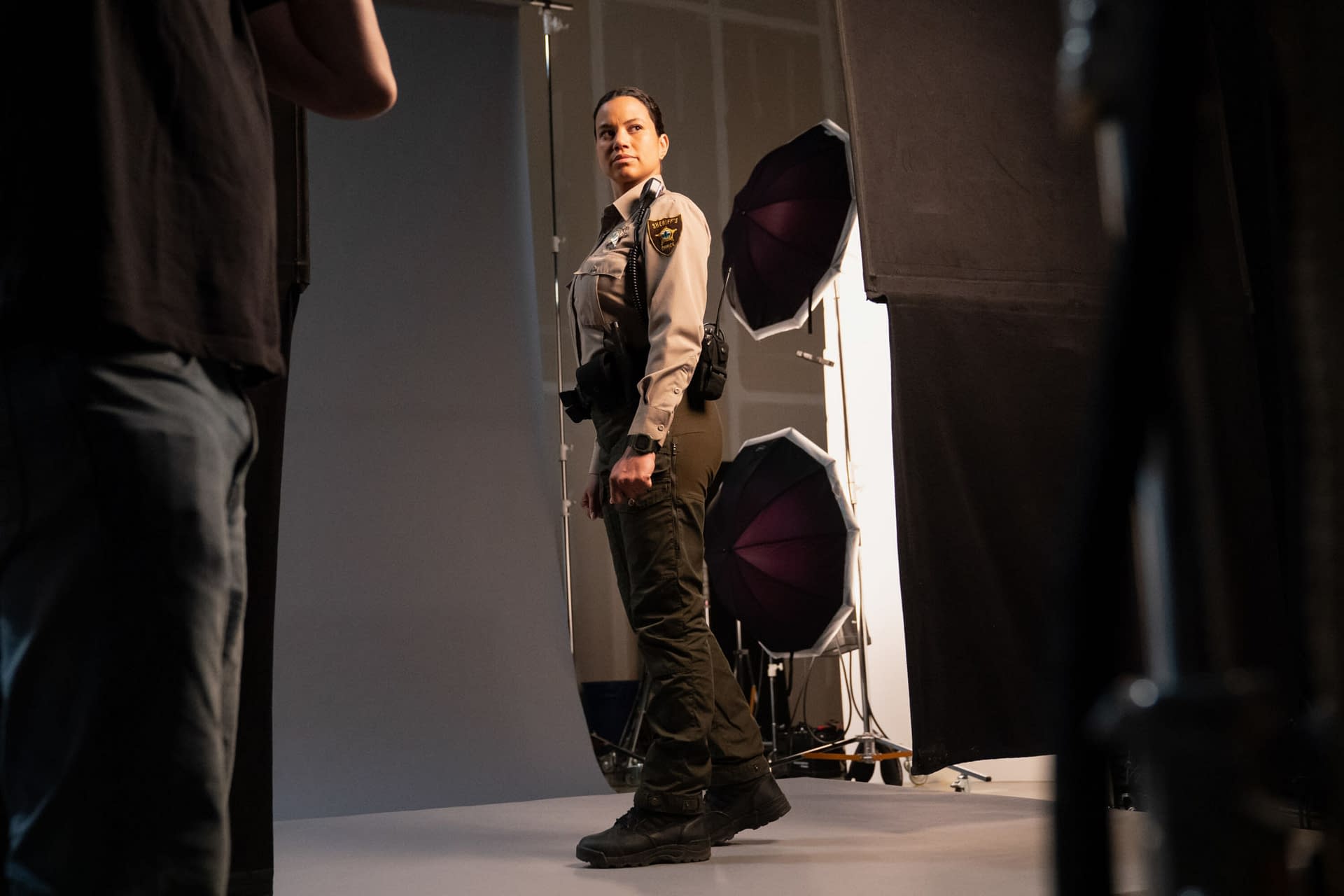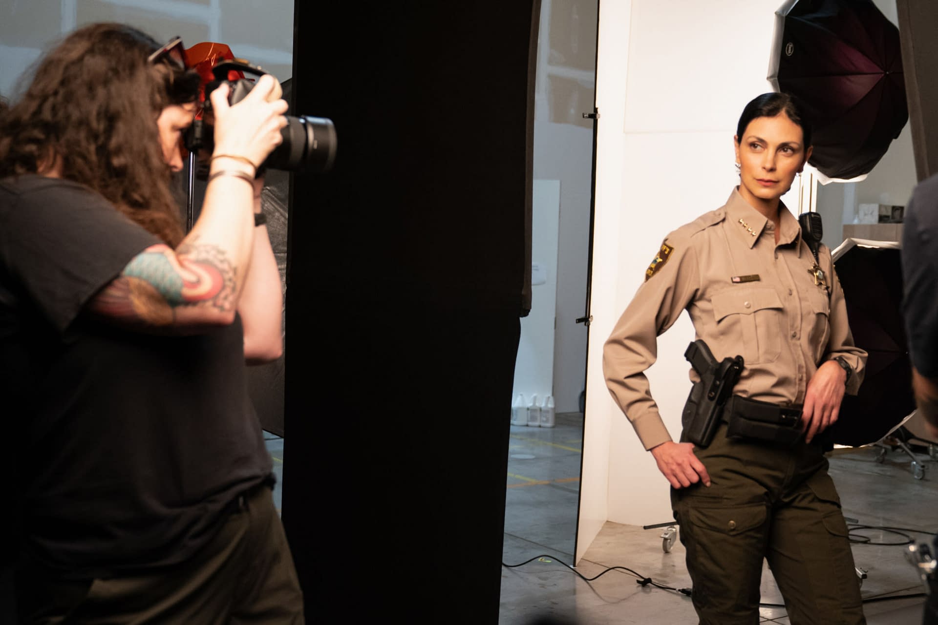 With only a little more than a month to go until CBS's Morena Baccarin and W. Earl Brown-starring Sheriff Country hits screens on Friday, October 17th, (before moving to its regular 8 pm ET timeslot beginning Oct. 24th), we have two image galleries from the "Fire Country" universe spinoff series. First, we have character profile images for the season's major players. Following that, we have some behind-the-scenes looks at the cast during their photo shoots for the series promos.