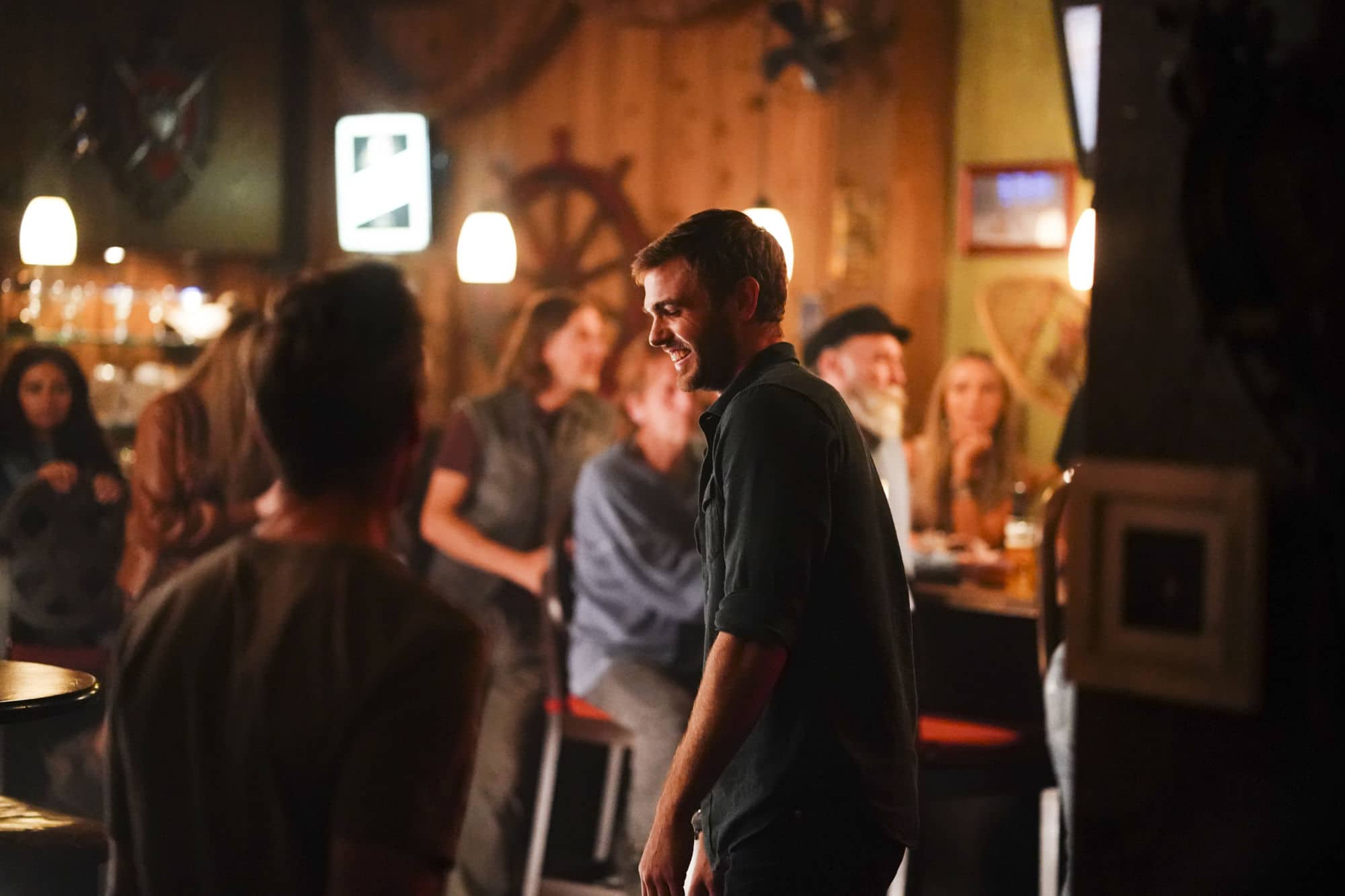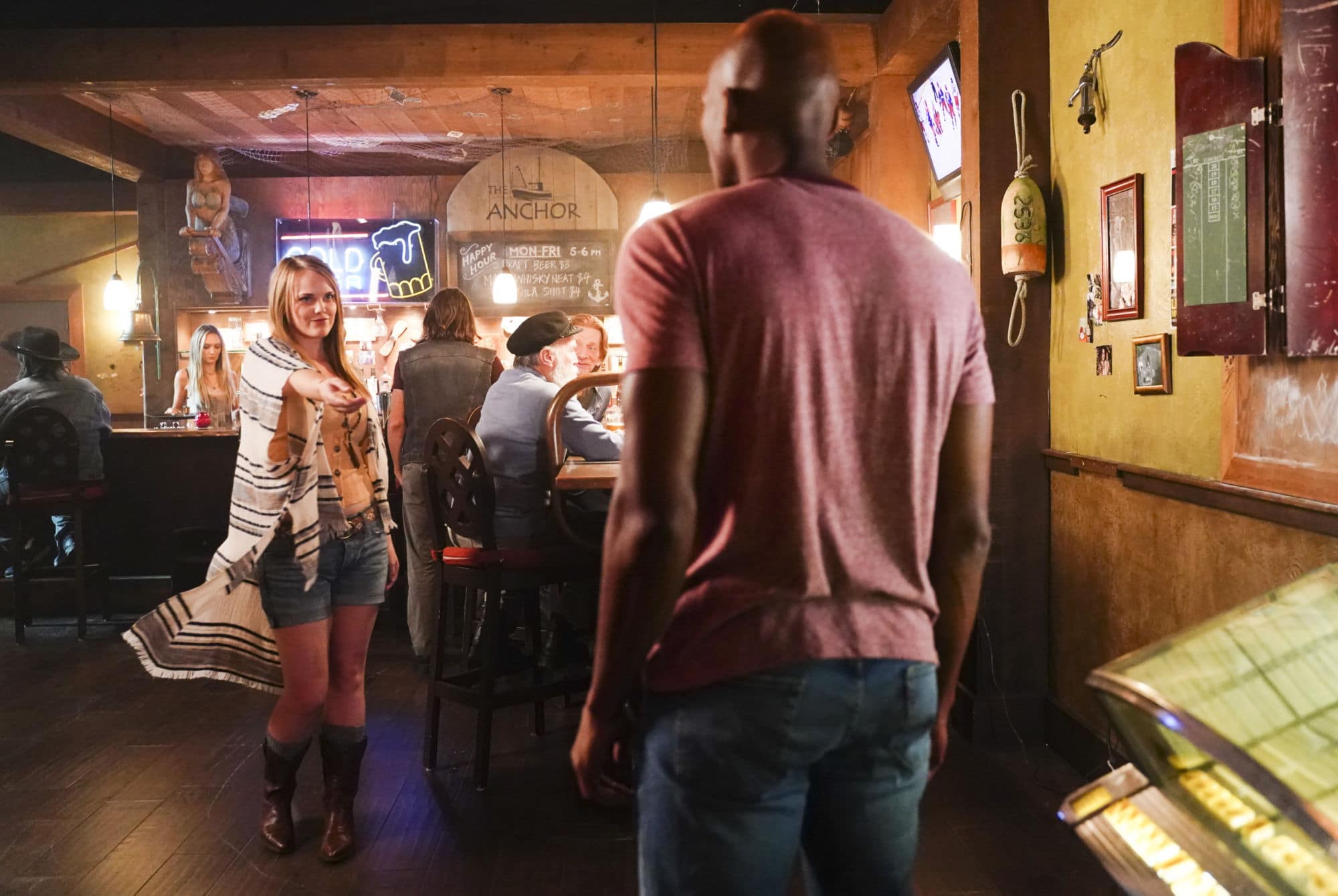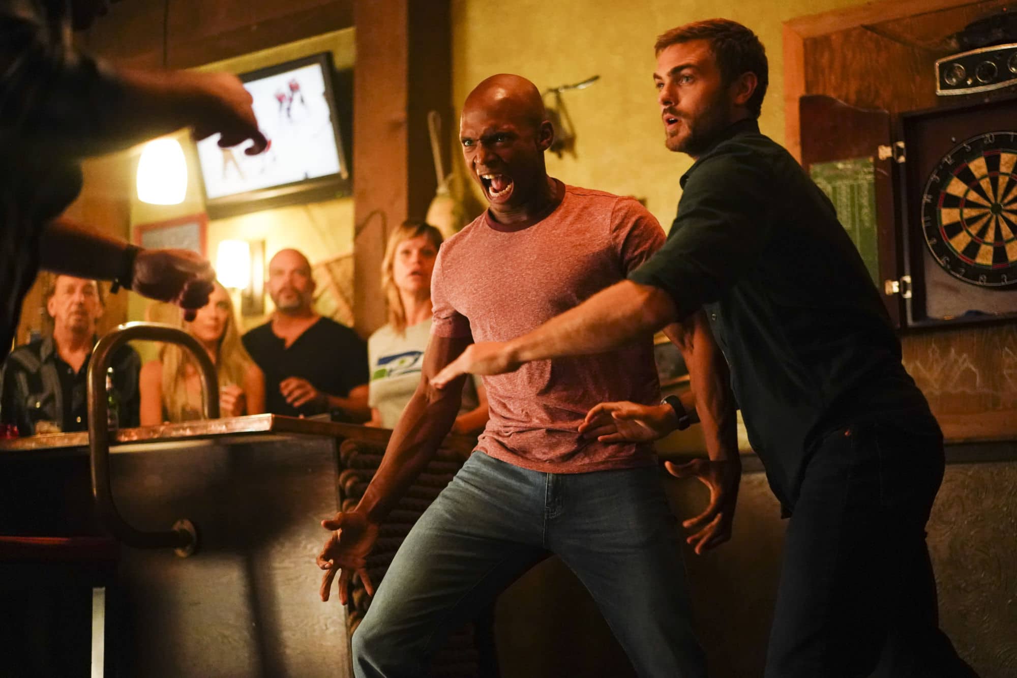 We're a quarter of the way through the second season of Freeform's mermaid-fantasy series Siren from Eric Wald and Dean White, and we think Ben (Alex Roe), Maddie (Fola Evans-Akingbola), and Ryn (Eline Powell) are starting to realize that Bristol Cove isn't New York City: there's only so many places you can hide a group of mermaids you don't want found. It doesn't help when said mermaids start feeling a little restless… so let's take them out to a bar!