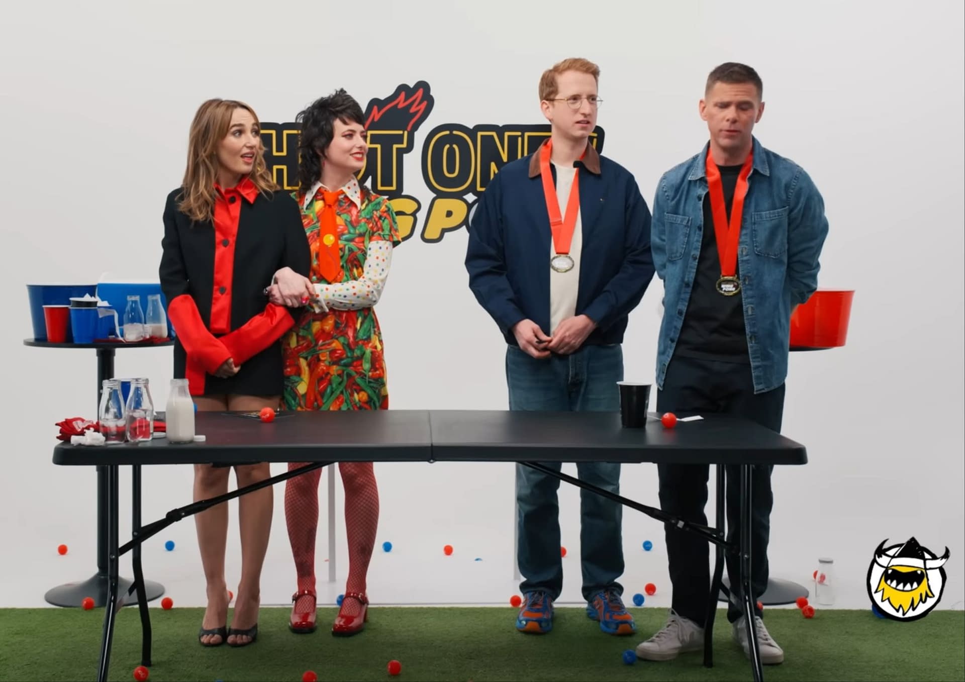 SNL's Chloe Fineman, Sarah Sherman, Mikey Day, and James Austin Johnson step up to the table to take on the challenge of Hot Ones Wing Pong.