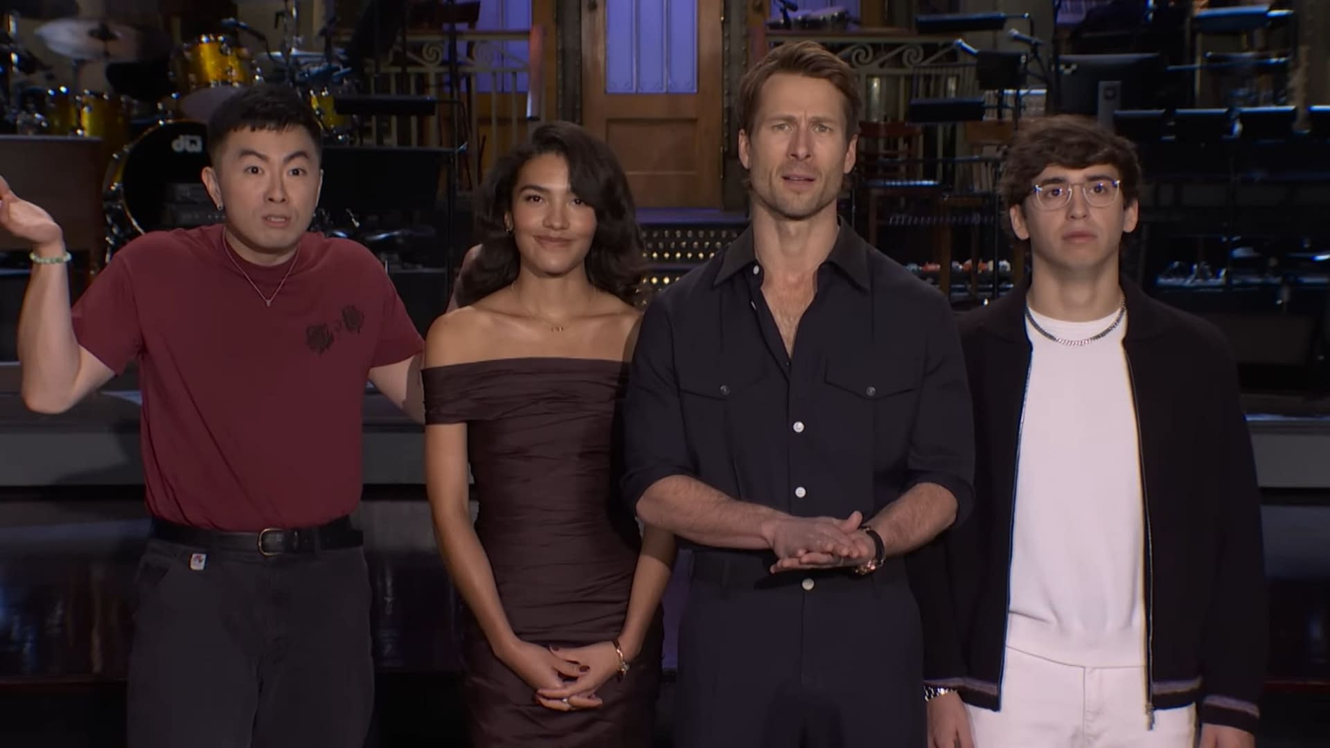 SNL host Glen Powell and musical guest Olivia Dean were joined by Bowen Yang and Marcello Hernandez for this week's on-stage promos.