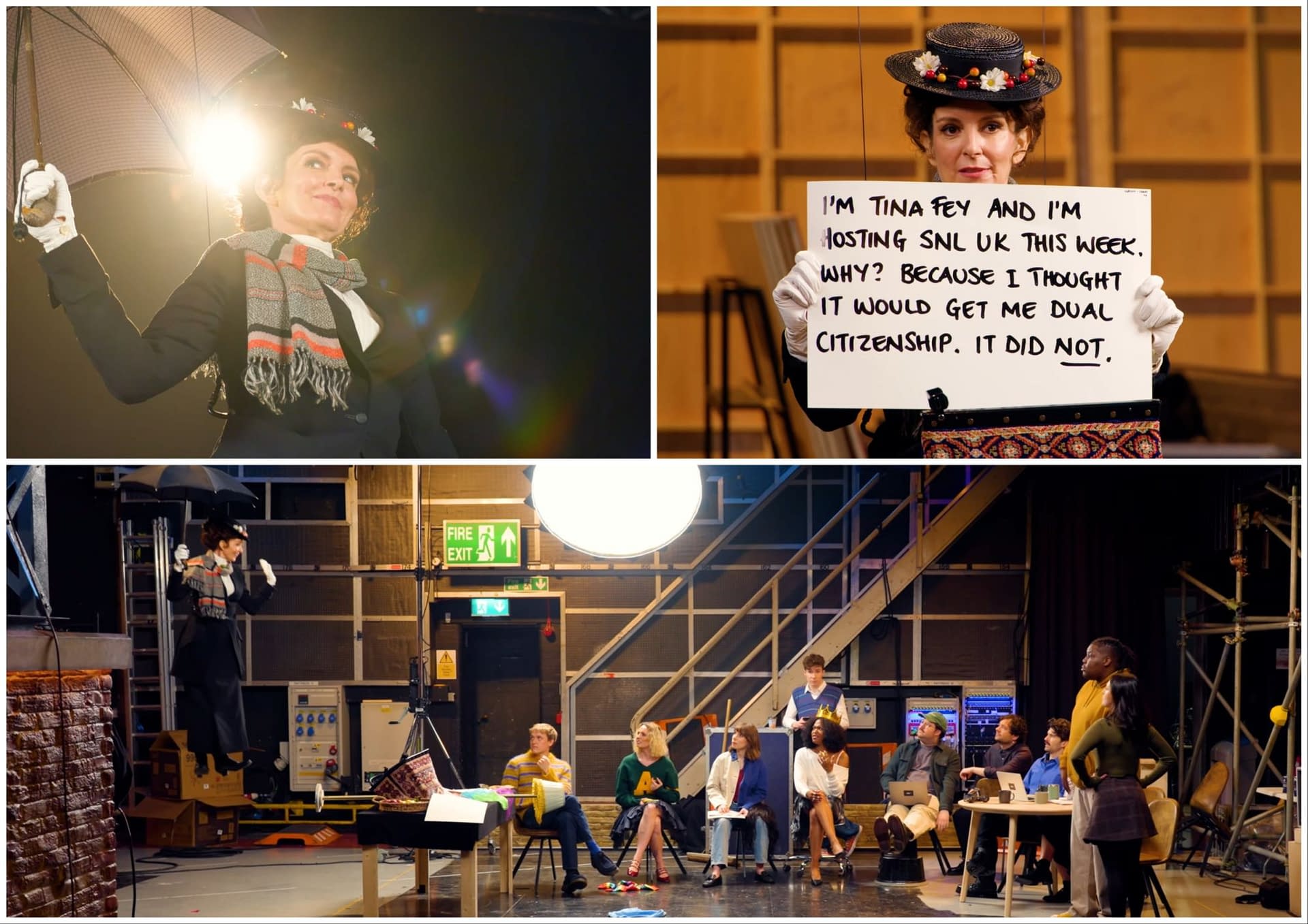 Saturday Night Live UK host Tina Fey went the Mary Poppins route to help the SNL UK cast get the word out about this weekend's premiere.