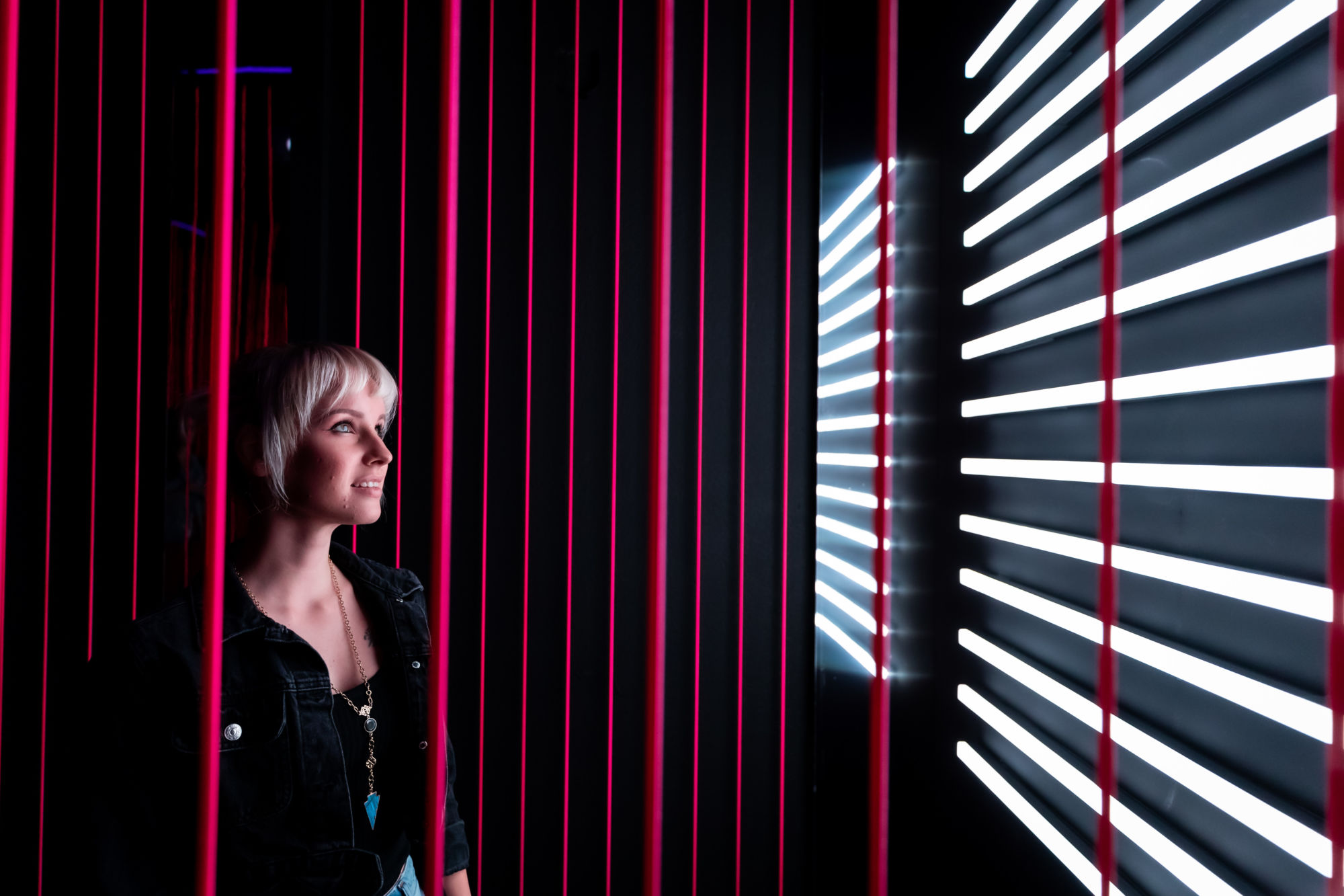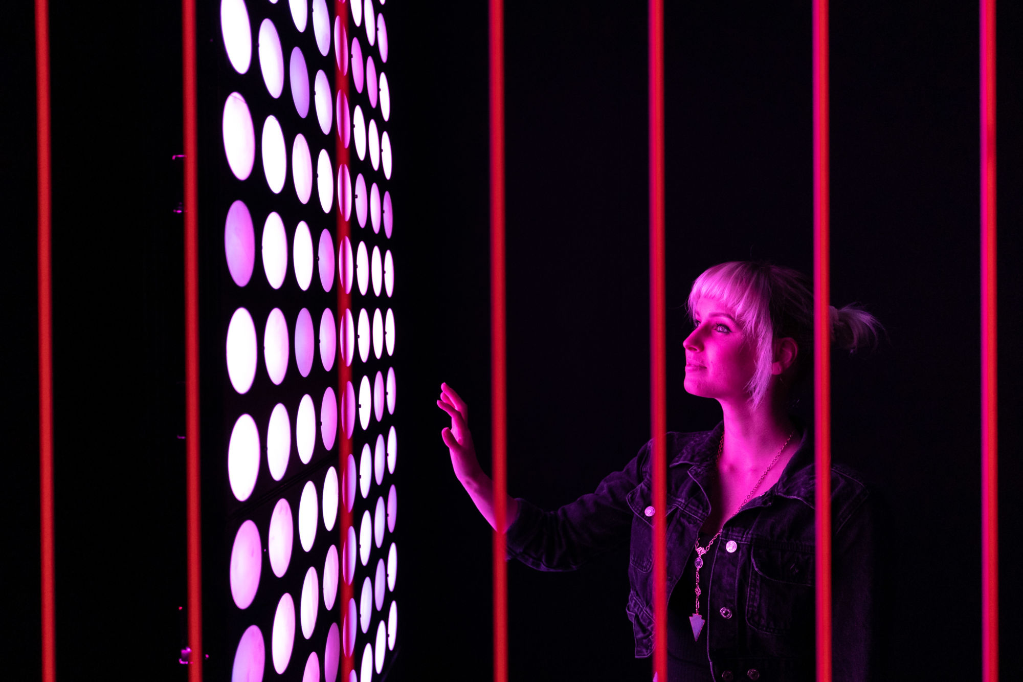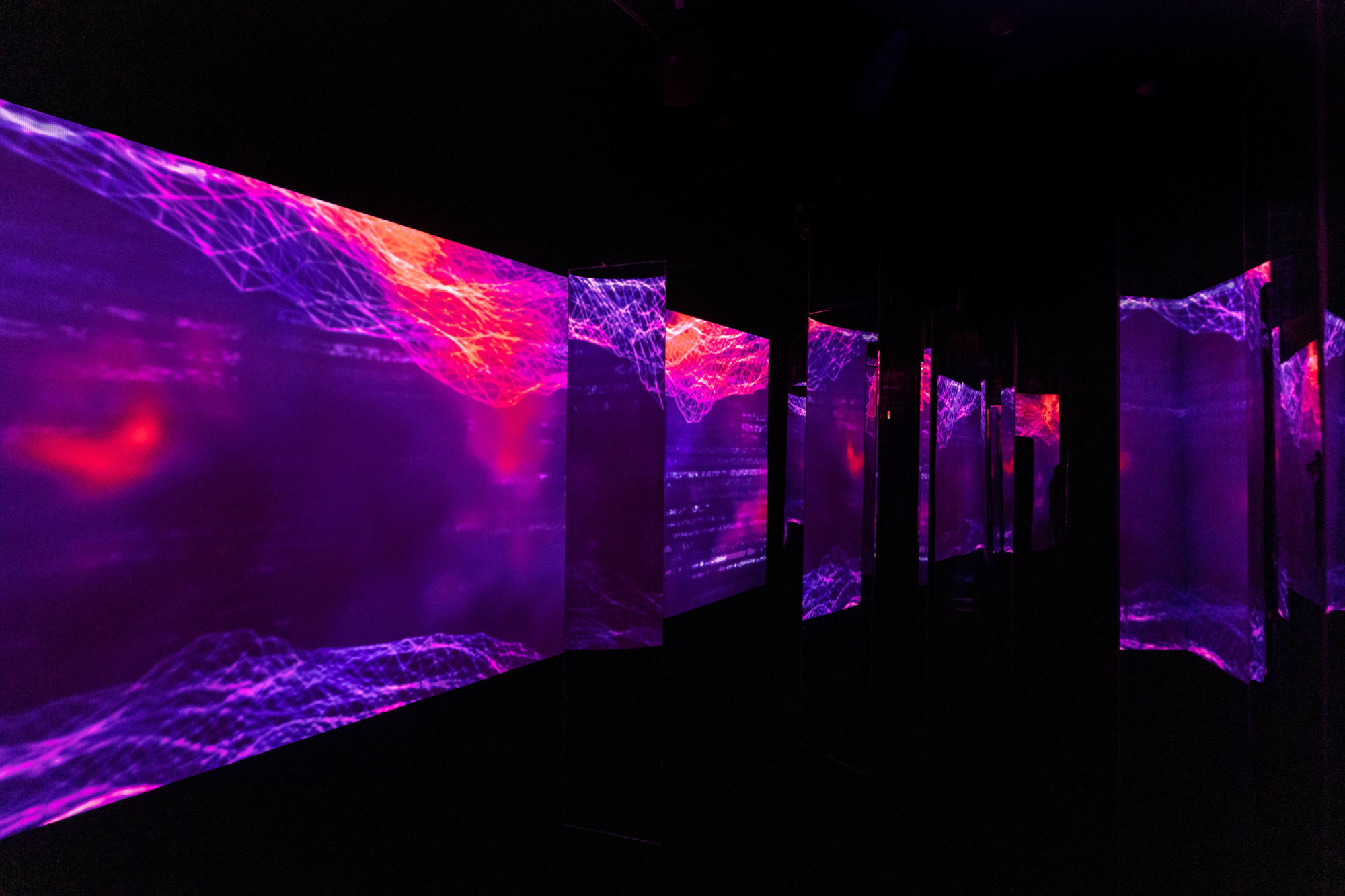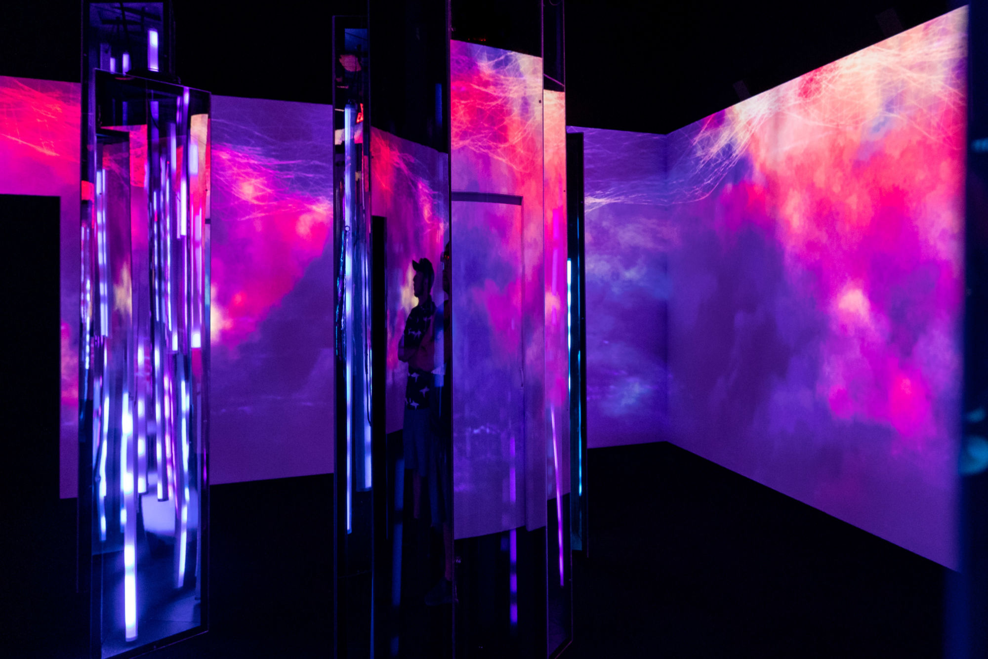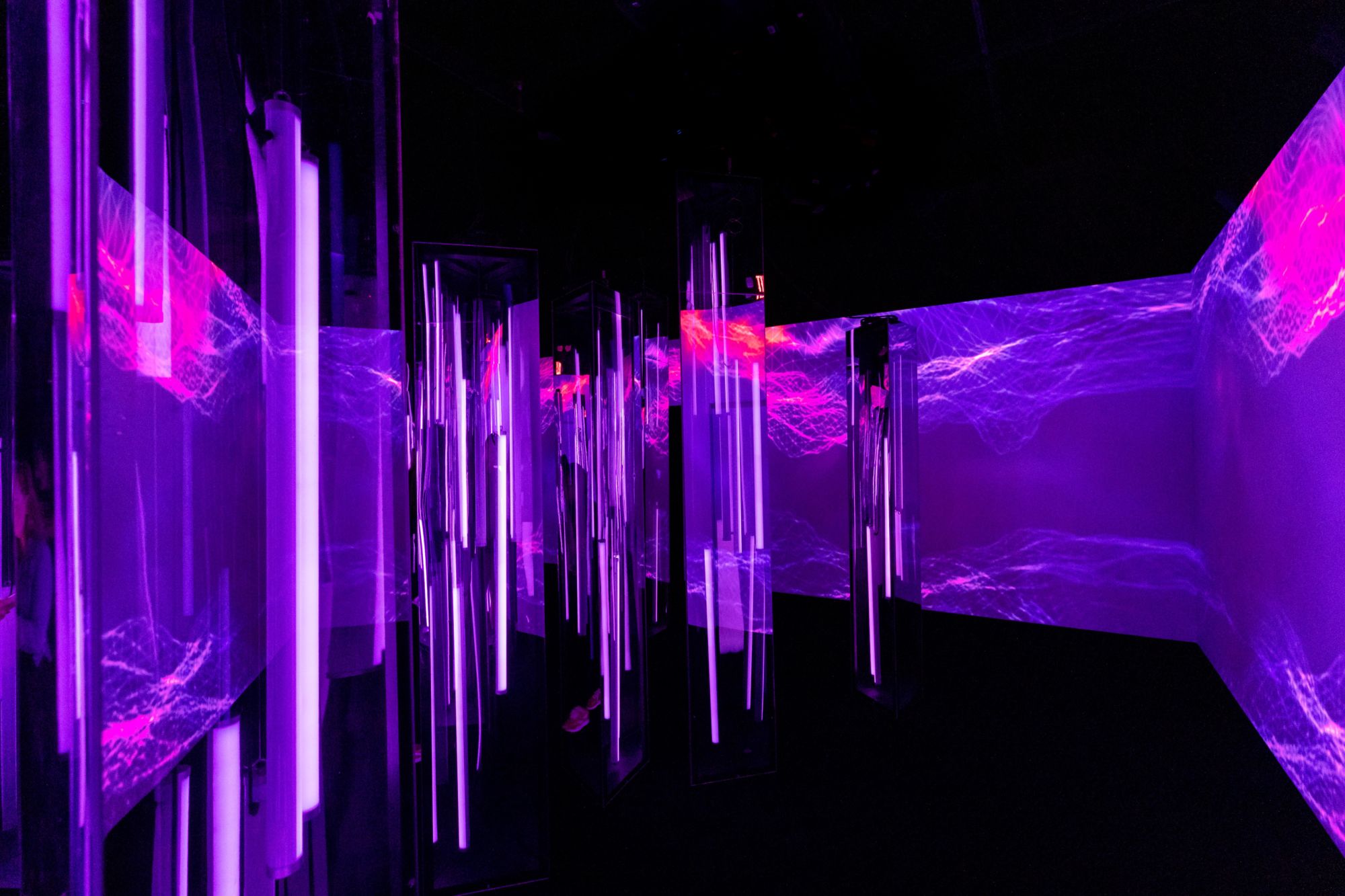 As you stand there looking around, projections of clouds appear on the walls, reflecting off of the pillars. Light bars within the pillars begin to flash as you see the sites and hear the sounds of an otherworldly storm around you. Yara Shahidi's voice, a clip from A Trick of Light fills the room as the projected storm rages around you.