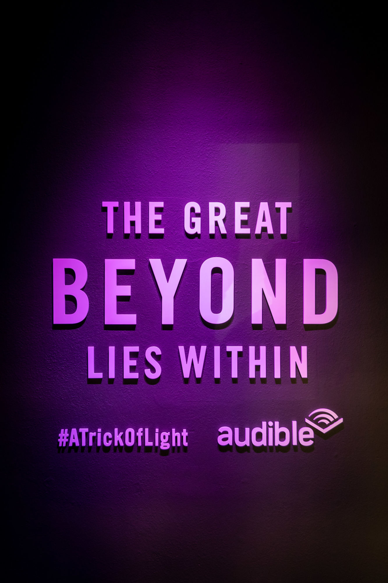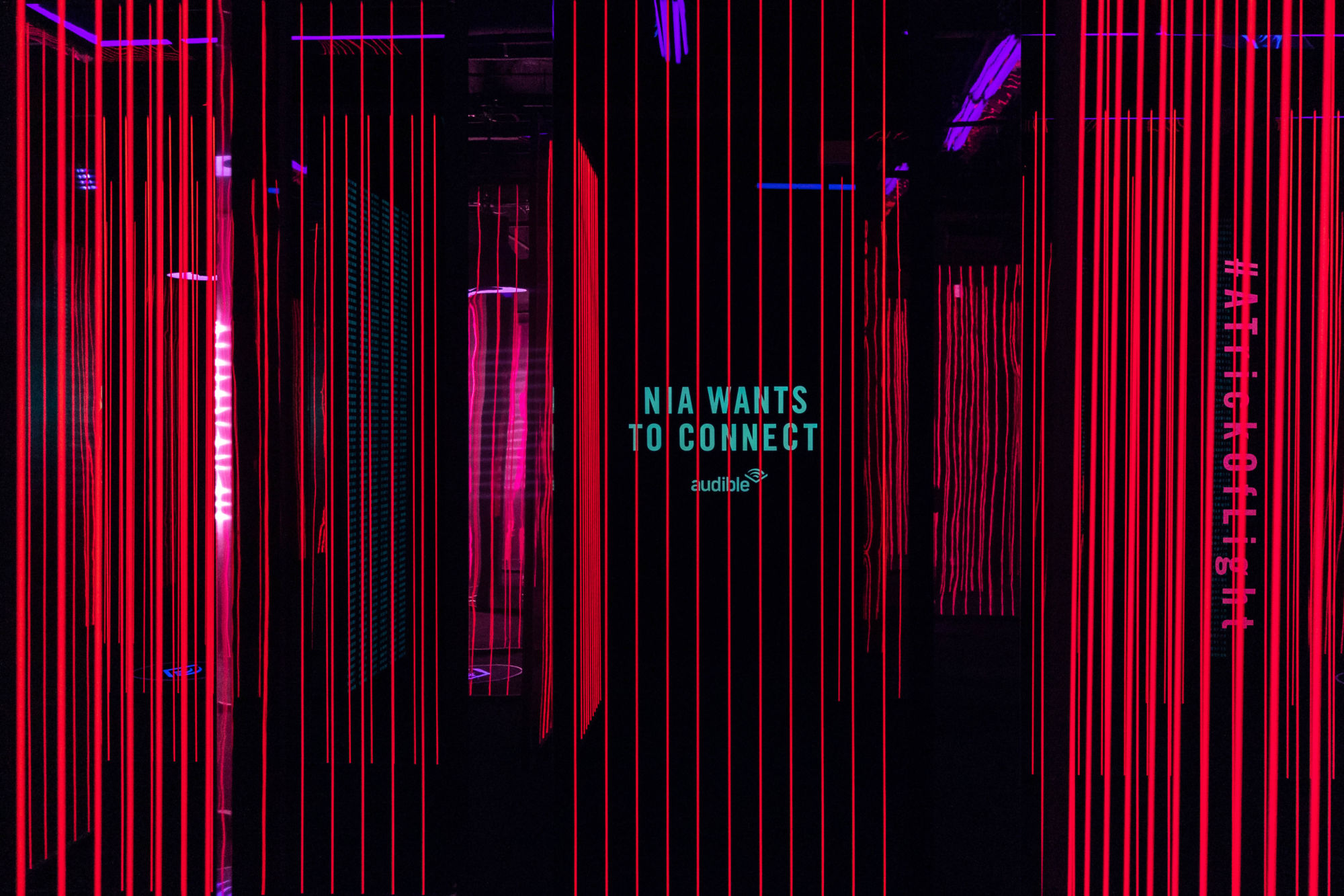 When the excerpt ends, you are led down a dark hallway to what looks like a doorway of lights. Only to find that the lights are a false entrance You turn and enter the Audible version of cyberspace. Red glowing elastic fences mark a maze of sorts. Quotes from the Audible appear on the walls.