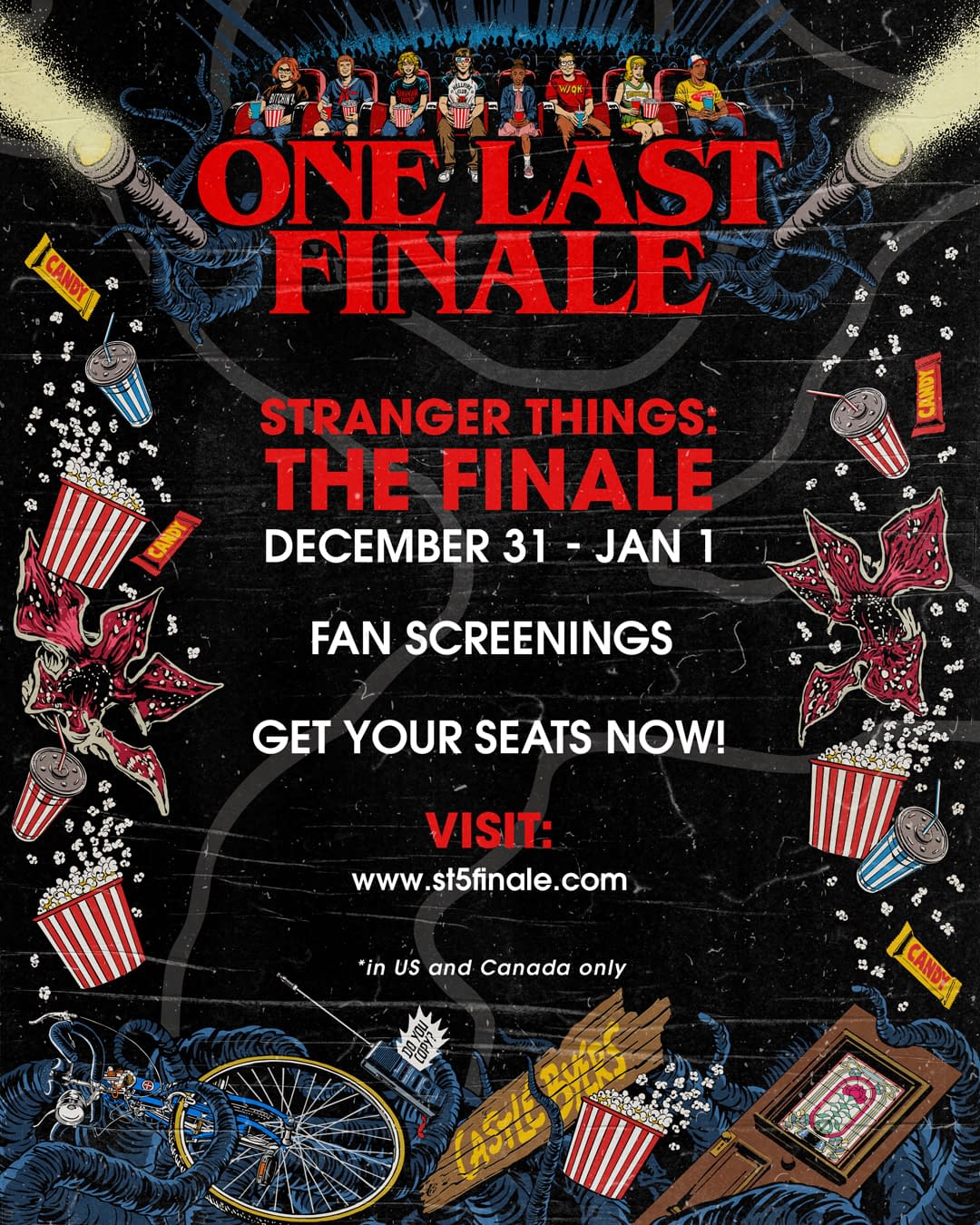 Today's the day, folks! As announced on Monday, tickets to see the season/series finale of Netflix and Ross Duffer & Matt Duffer's Stranger Things 5 in theaters are officially on sale. "The Rightside Up" will premiere on the streaming service and in more than 500 movie theaters in the U.S. and Canada on December 31st, starting at 5:00 p.m. PT / 8:00 p.m. ET, and will play through January 1, 2026. The finale's runtime has been locked in at 2 hours, 5 minutes, and you can get tickets and more info over at STFinale.com.