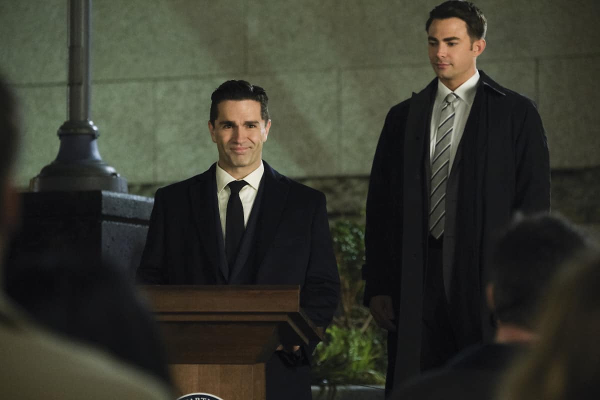 - Supergirl — "Stand and Deliver" — Image Number: SPG414B_0351b.jpg — Pictured (L-R): Sam Witwer as Ben Lockwood/Agent Liberty and Jonathan Bennett as Quentin — Photo: Jeff Weddell/The CW — é 2019 The CW Network, LLC. All Rights Reserved.