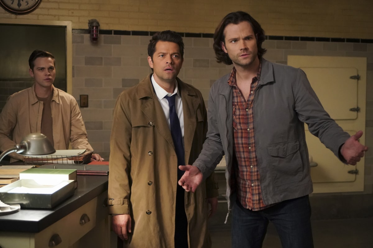 - Supernatural — "Ouroboros" — Image Number: SN1414A_0197b.jpg — Pictured (L-R): Misha Collins as Castiel, Jensen Ackles as Dean and Jared Padalecki as Sam — Photo: Shane Harvey/The CW — é 2019 The CW Network, LLC. All Rights Reserved.