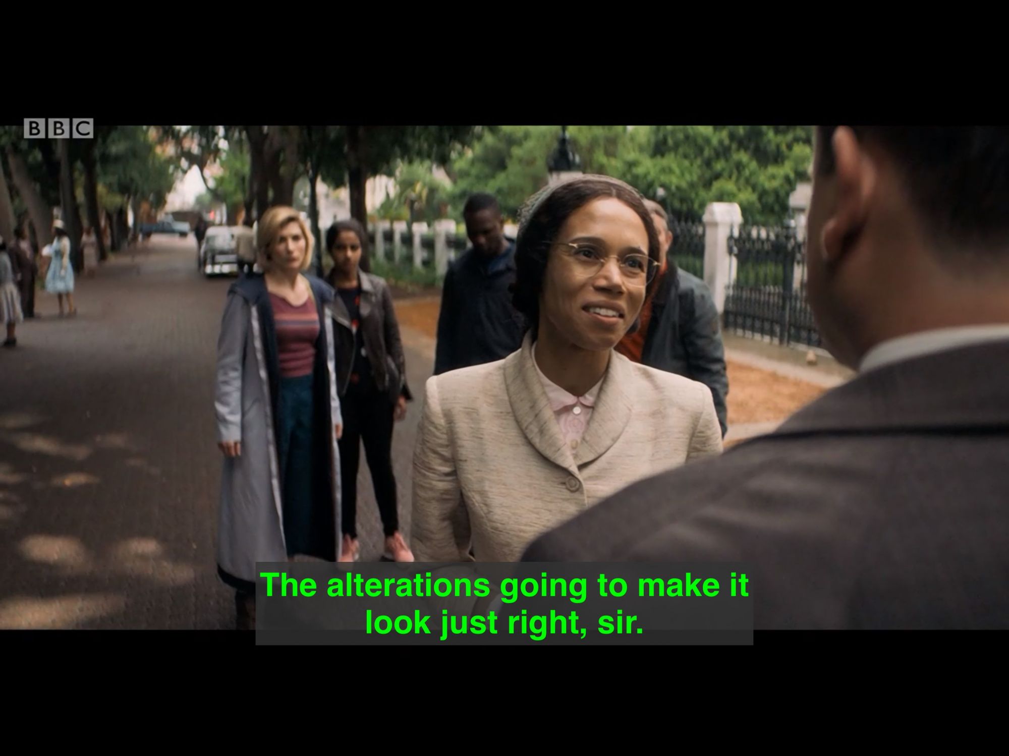 The episode is called Rosa – not just a reference to Rosa Parks, the American Civil Rights' icon. It is also a reference to the very first episode of the revived Doctor Who – Rose. And as with her, the idea that one person can make such a massive difference, and their absence could rip the universe apart. Note that we don't start in 1953 but 1943, same Rosa, same bus driver, that this small moment of resistance had been building over the decade.
