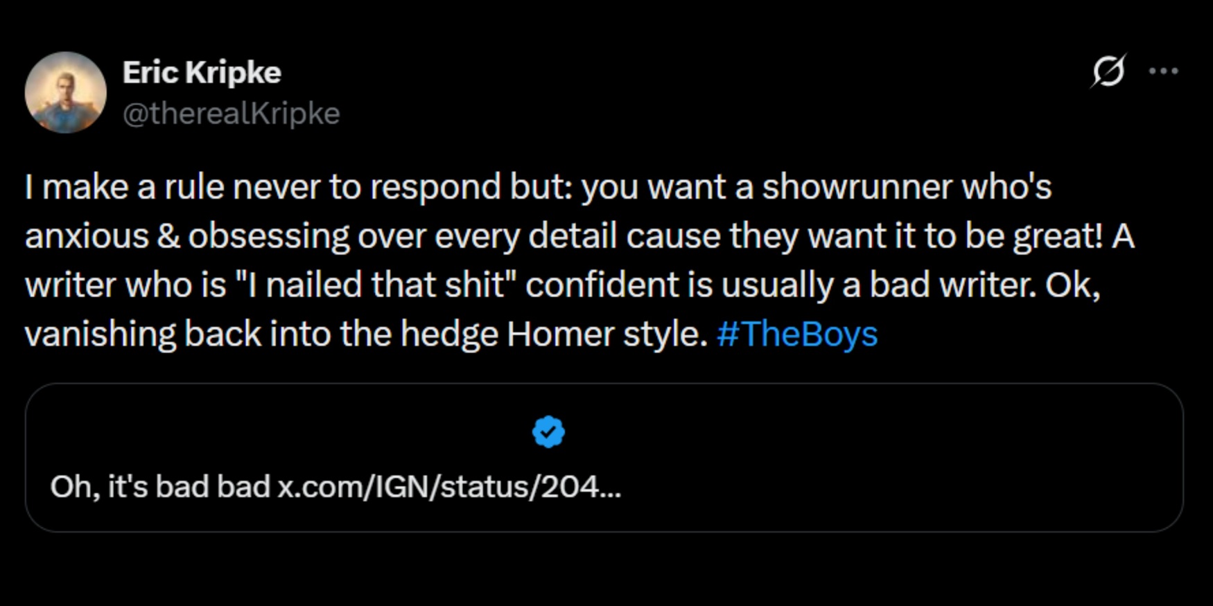 So, when someone takes his words and warps them into an implication that Kripke knows the series finale is a disappointment and that he's trying to soften the blow for viewers by getting out ahead of it and spreading the blame, we're glad to see Kripke pause his rule about not directly responding to trash on social media to shut down that nonsense. "I make a rule never to respond but: you want a showrunner who's anxious & obsessing over every detail cause they want it to be great! A writer who is 'I nailed that shit' confident is usually a bad writer. Ok, vanishing back into the hedge Homer style," Kripke posted, reminding everyone that he has just as much invested as an artist in the series and its legacy as anyone else.