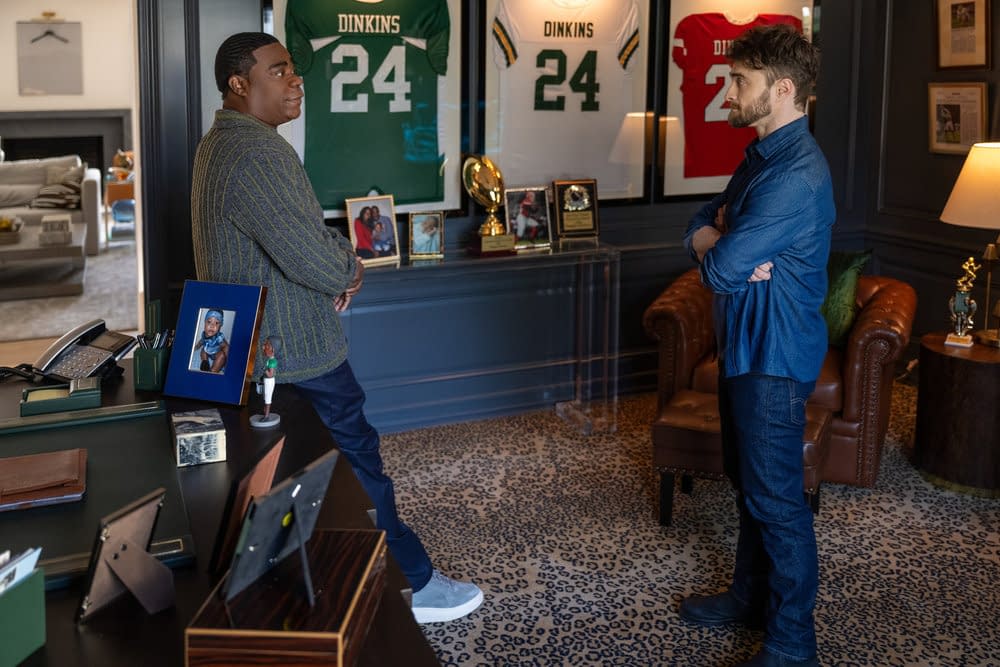 After getting a chance to check out the eagerly anticipated new series earlier this year, NBC and Showrunners Robert Carlock and Sam Means' Tracy Morgan and Daniel Radcliffe-starring The Fall and Rise of Reggie Dinkins makes its official, two-episode premiere tonight. After an encore airing of the series opener at 8 pm ET, a brand new episode will follow at 8:30 pm ET – and we have a look at what you can expect with the official overviews, image galleries, and more for S01E01 "Pilot" and S01E02: "Nittany Means Big" – here's a look!