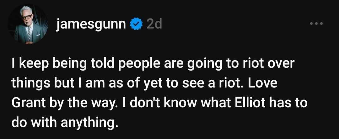 Regarding Gustin and his talents, Gunn has always made it clear that he likes and appreciates him as an actor. Back in March 2024, Gunn was asked on Threads about Gustin being cast in the new DCU, with the person adding that "all his talent is going to waste." But Gunn didn't quite see it that way. "Grant is an incredibly talented guy, performing now on Broadway, I believe, and is absolutely not going to waste just because he's not currently in a DC project. But of course I'd love to work with him at some point," Gunn responded, referencing Gustin's current run on Broadway's Water for Elephants. And you'll also notice that Gunn leaves the door slightly open for the two of them to possibly work together in the future – here's a look: