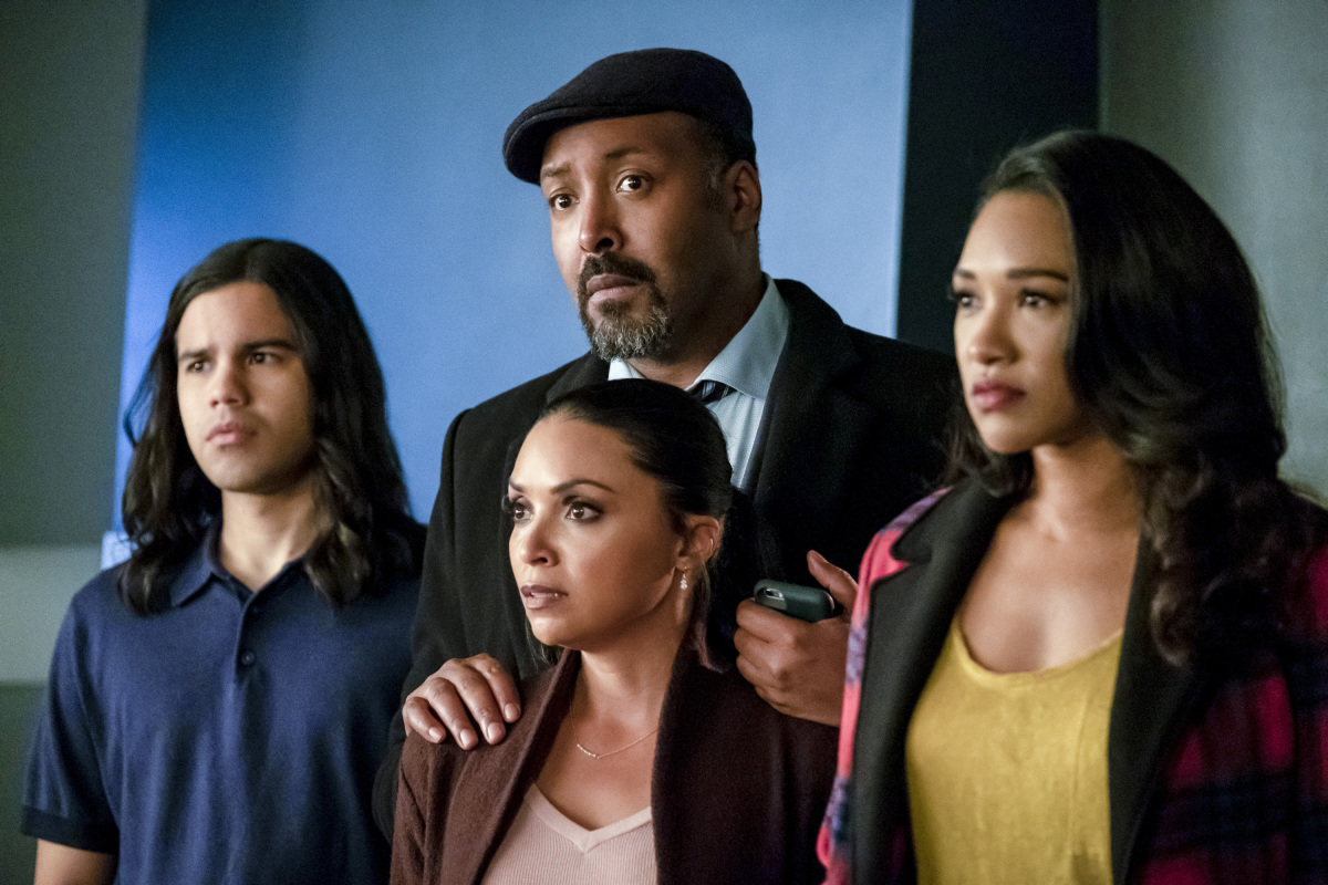 - The Flash — "Time Bomb" — Image Number: FLA517c_0158b.jpg — Pictured (L-R): Danielle Nicolet as Cecile Horton, Jesse L. Martin as Detective Joe West, Candice Patton as Iris West – Allen, Grant Gustin as Barry Allen, Danielle Panabaker as Caitlin Snow — Photo: Katie Yu/The CW — é 2019 The CW Network, LLC. All rights reserved
