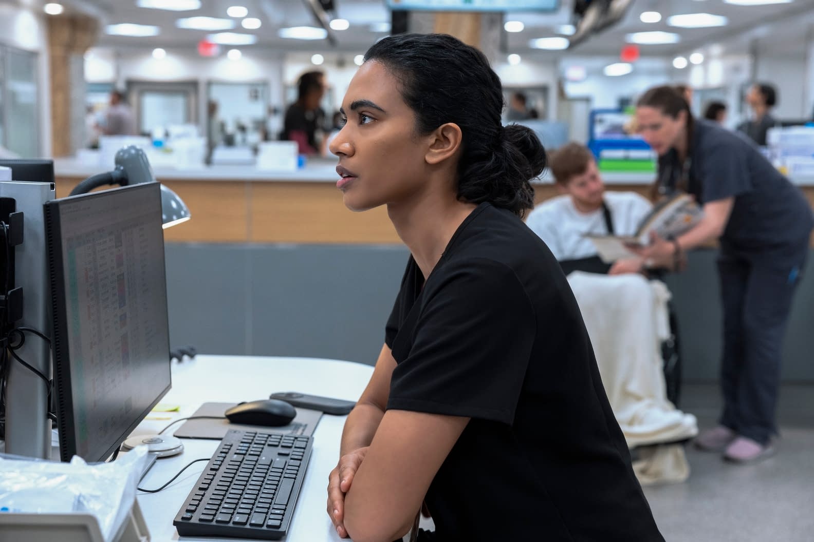 - Robby walks in on Al-Hashimi's training session; He welcomes her to The Pitt. (Warrick Page for MAX)