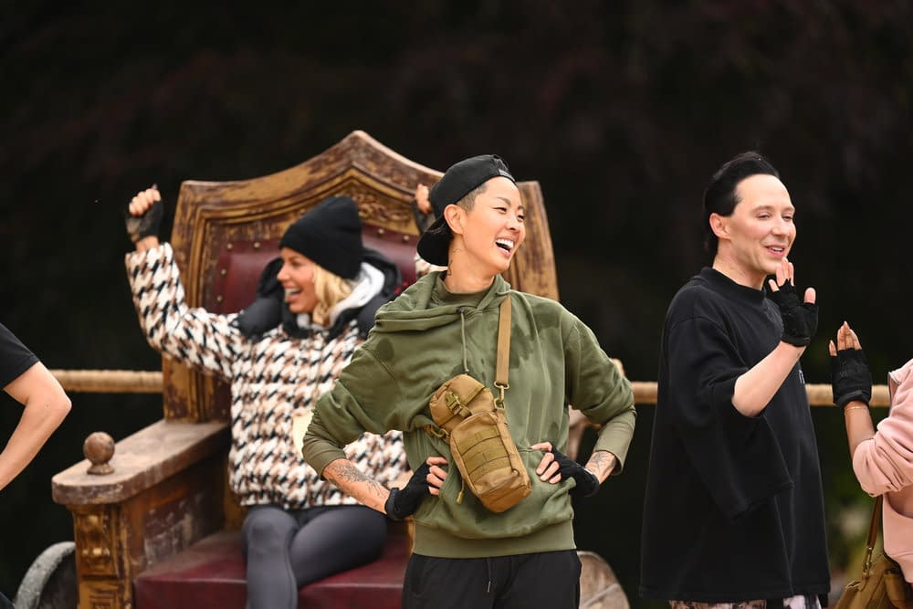 - The Death Conga" Episode 402 — Pictured: (l-r) Tara Lipinski, Maura Higgins, Johnny Weir — (Photo by: Euan Cherry/Peacock)