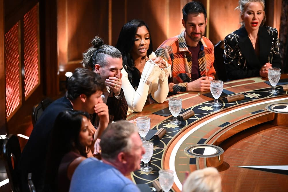 - The Death Conga" Episode 402 — Pictured: (l-r) Rob Rausch, Candiace Dillard Bassett, Johnny Weir, Dorinda Medley, Porsha Williams, Stephen Colletti, Mark Ballas, Ron Funches, Tara Lipinski, Michael Rapaport — (Photo by: Euan Cherry/Peacock)