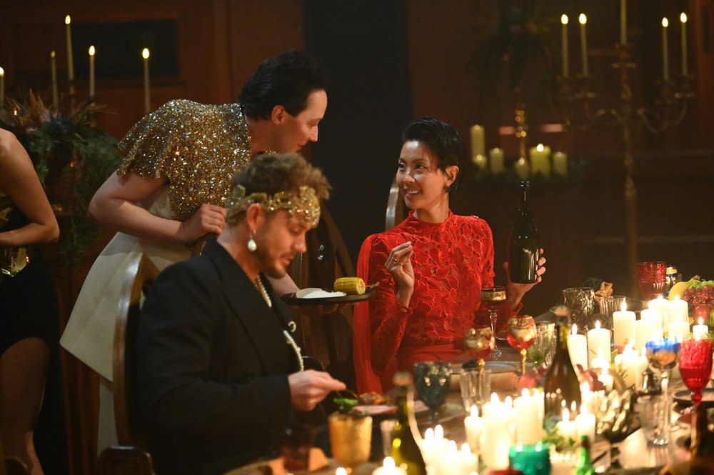 - "The Black Banquet" Episode 407 — Pictured: (l-r) Maura Higgins, Johnny Weir, Tara Lipinski — (Photo by: Euan Cherry/PEACOCK)