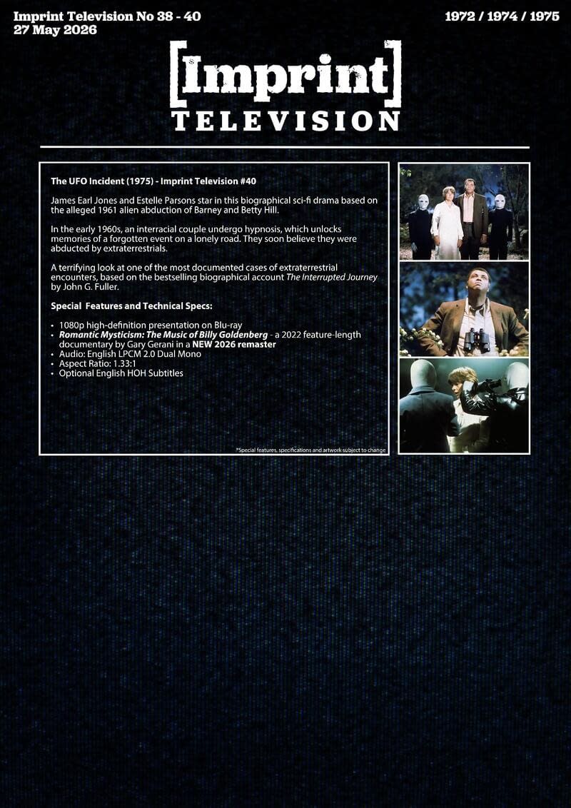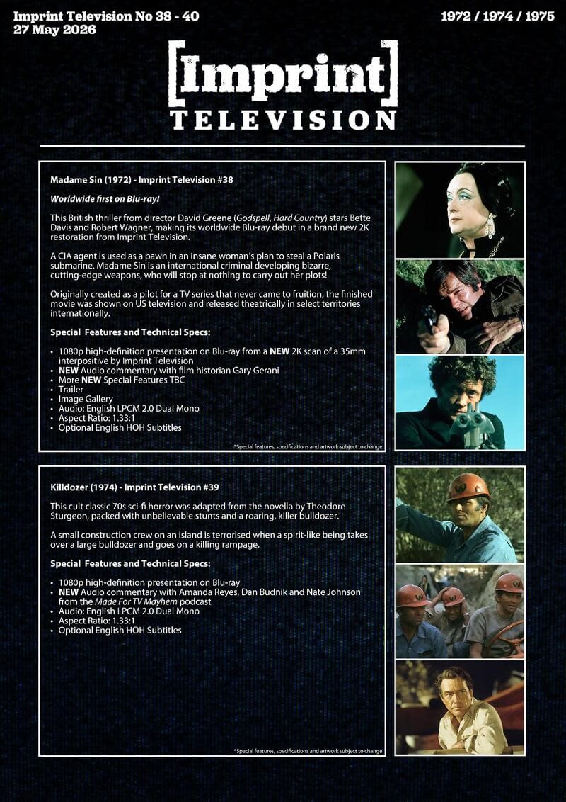 - Imprint Films launches Made-for-TV Movies Vol. 5 with Madame Sin, Killdozer, and The UFO Incident on May 27.