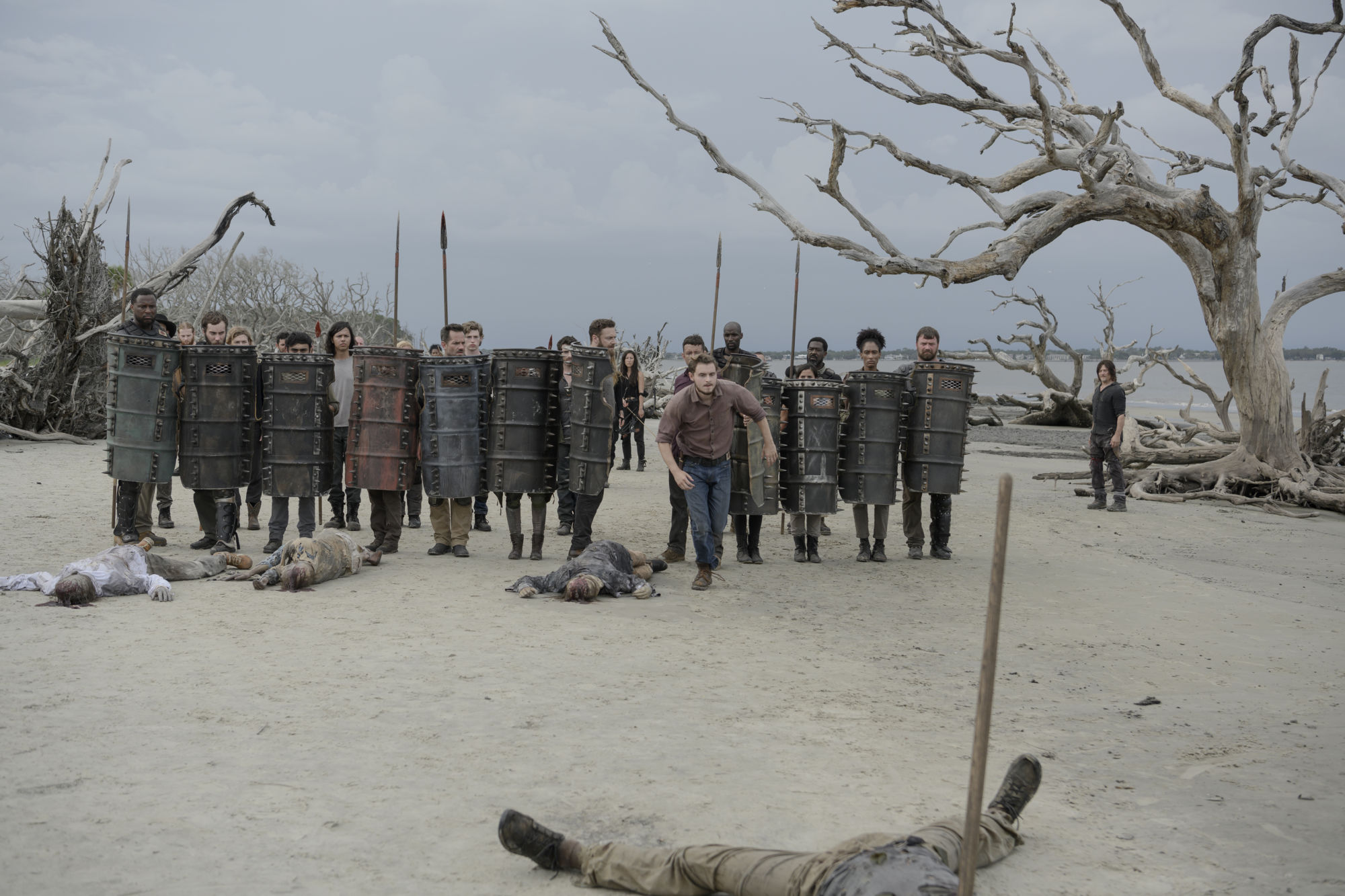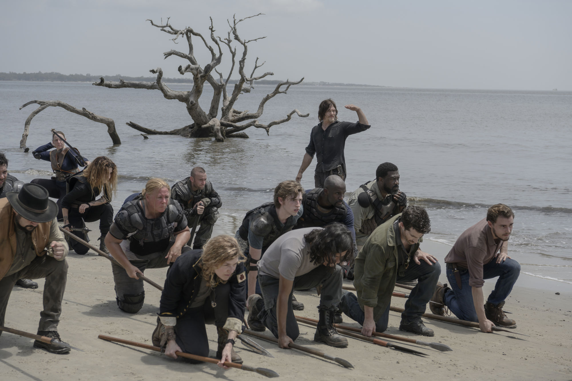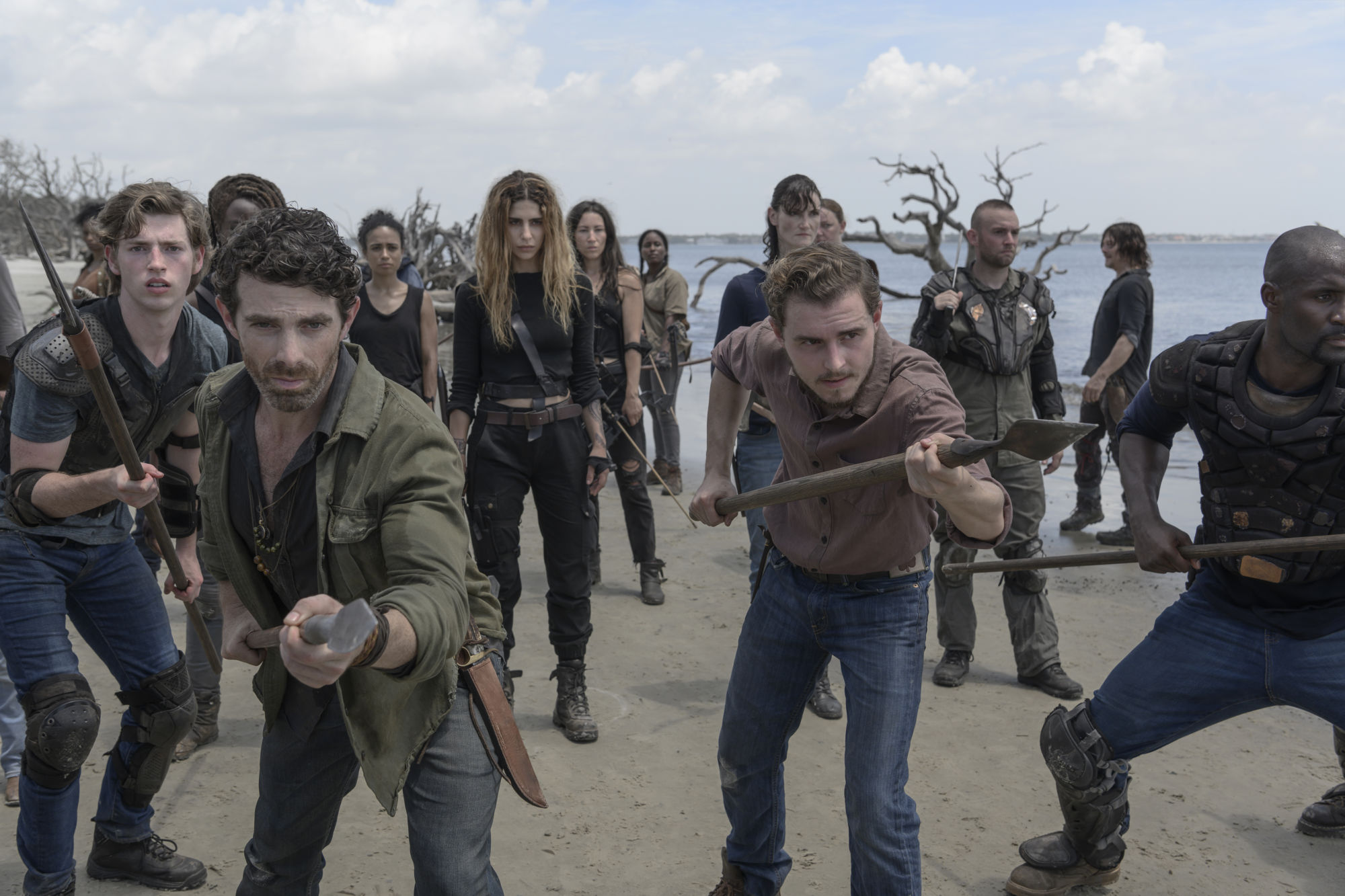 - Norman Reedus as Daryl Dixon, Sydney Park as Cyndie; group – The Walking Dead _ Season 10, Episode 1 – Photo Credit: Jackson Lee Davis/AMC