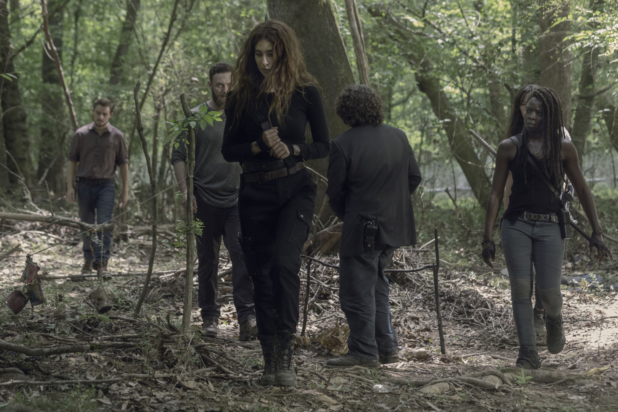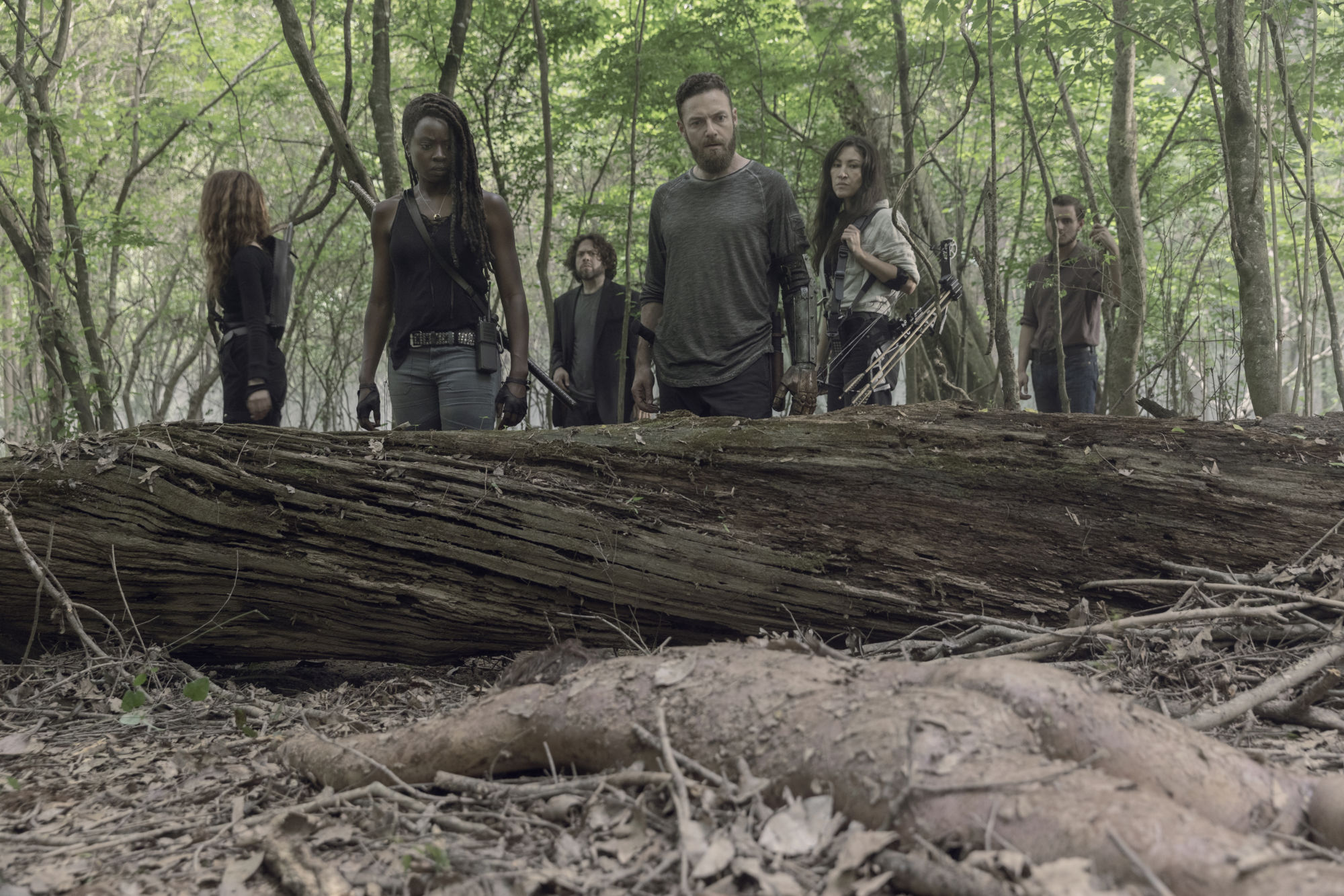 - Dan Fogler as Luke, Eleanor Matsuura as Yumiko, Nadia Hilker as Magna, Danai Gurira as Michonne, Ross Marquand as Aaron, Callan McAuliffe as Alden – The Walking Dead _ Season 10 – Photo Credit: Jackson Lee Davis/AMC