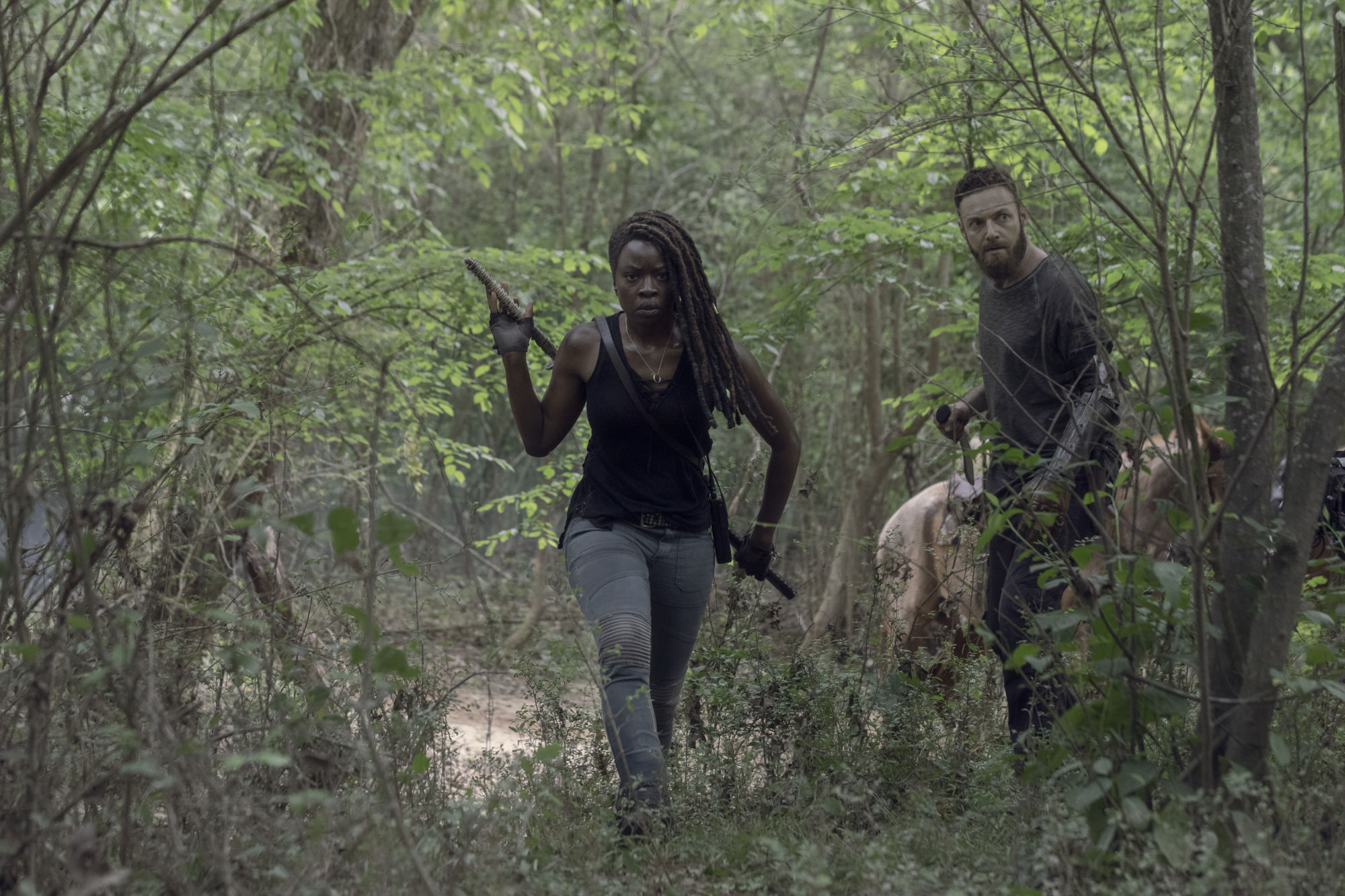 - Danai Gurira as Michonne, Ross Marquand as Aaron – The Walking Dead _ Season 10, Episode 1 – Photo Credit: Jackson Lee Davis/AMC