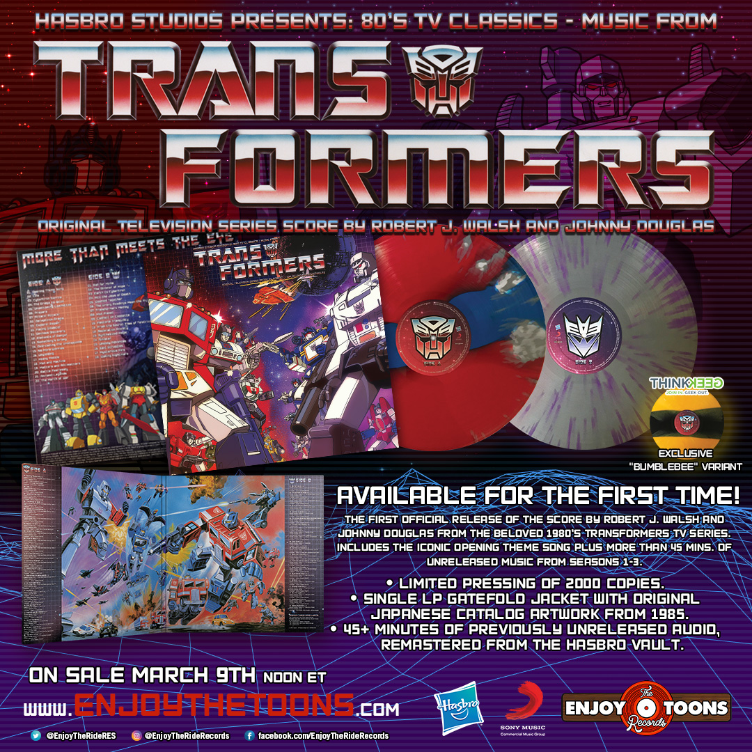 Enjoy The Ride Records and Sony Music/Legacy Recordings announced today the release of Hasbro Studios Presents '80s TV Classics: Music from The Transformers on vinyl in three different color variants, available at select retailers Friday, March 9. This is the first official release of the score in any format and includes the iconic opening theme song and more than 45 minutes of unreleased music by composers Robert J. Walsh, Johnny Douglas, Anne Bryant and Ford Kinder. The album features music from seasons 1-3 of "The Transformers" animated series which debuted in 1984.