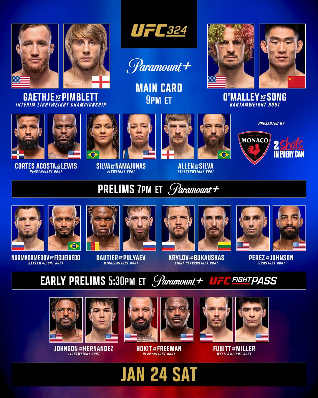 Two months after the news hit that Paramount Skydance and UFC would be making some beautiful (and bloody) music together for the foreseeable future, we're about to see what the new deal has to offer tonight with UFC 324: Gaethje vs Pimblett. In the main event, former interim UFC lightweight champion and former BMF titleholder Justin Gaethje takes on fan favorite Paddy "The Baddy" Pimblett for the interim UFC lightweight title. In the co-main event, a bantamweight bout pits former UFC champion and current No. 2-ranked contender Sean O'Malley against No. 5-ranked Song Yadong. Of course, there's a whole lot more MMA action going on during the early prelims, prelims, and remainder of the main card – and that's what we have waiting for you below. But before we get to that, here are the basics you need to know to check out UFC 324: