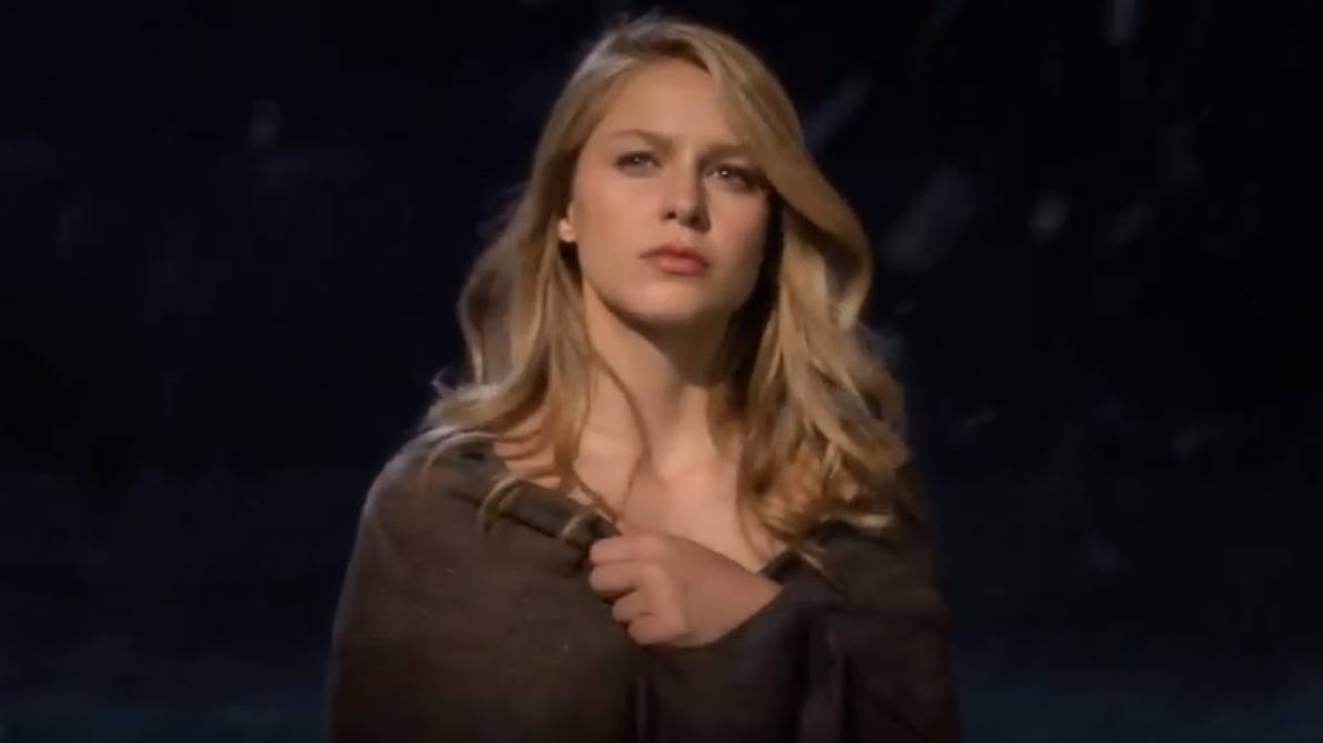 The final scene in last night season finale of Supergirl took place on the Siberian border as soldiers responded to an alarm and raced out to find a woman walking towards them in the snow. We then see Kara, wrapped only in a blanket, and looking somewhat stern. As we see below.